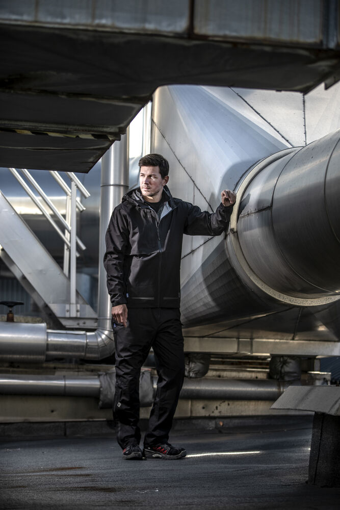 Vind- og vanntette bukser med god pusteevne og teipede sømmer. Elastisk midje med snor. Sidelommer på begge sider. Glidelåser langs bena for å gjøre det lettere å kle av og på, dekket med klaff – også justerbar bredde med borrelås.