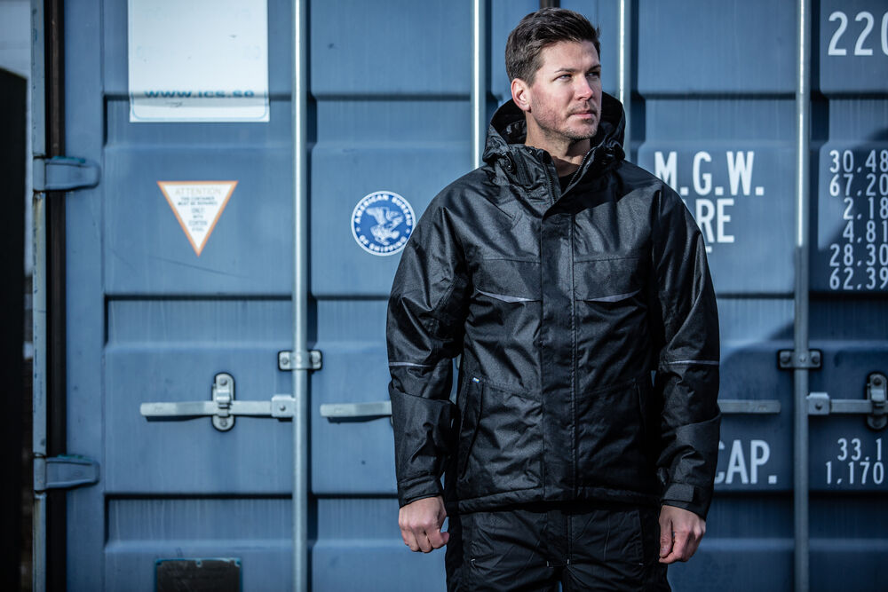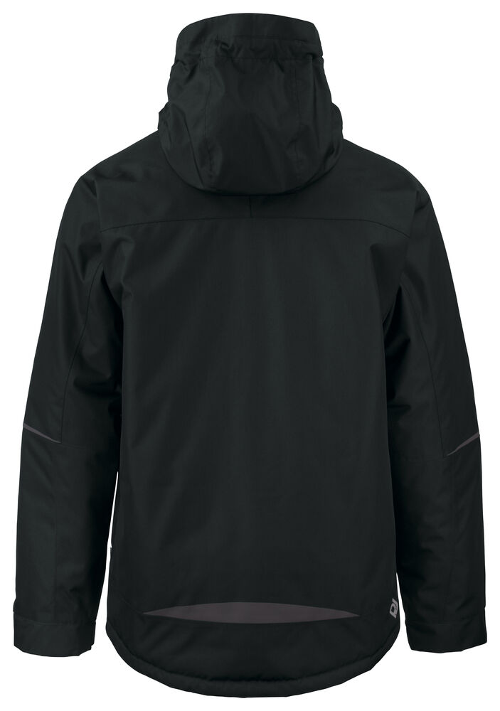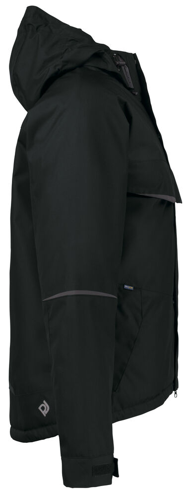 Vind- og vanntett jakke med pustende egenskaper og tapede sømmer. Vattert polstret fôr. Høy krage med avtakbar hette. Sidelommer med klaff. To store brystlommer med klaff. Hellang glidelås helt opp til kragen, beskyttet av knepping med skjulte trykknapper. Refleksdetaljer for bedre synlighet. Mansjetter med borrelås. Zip med enhåndsgrep i siden. Glidelås på innsiden for logomerking.