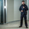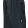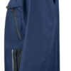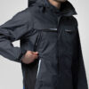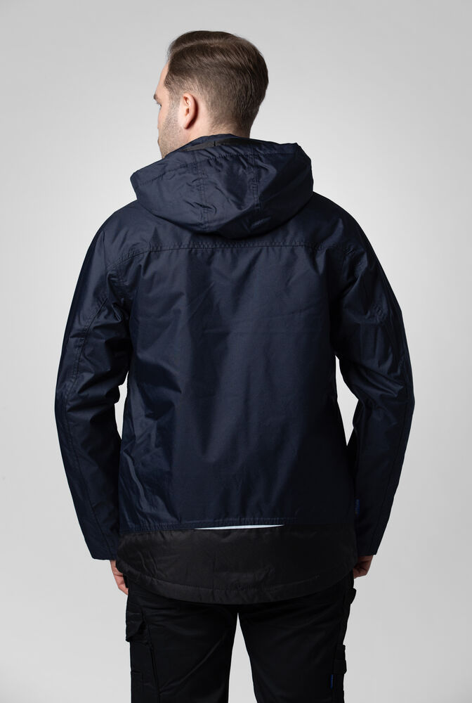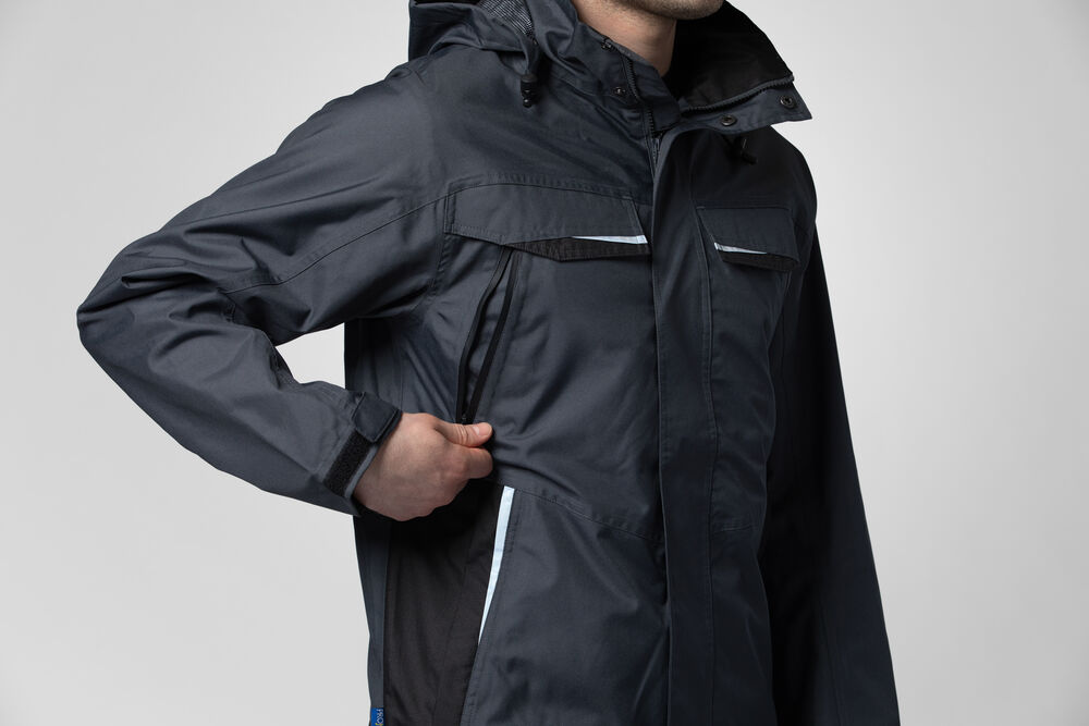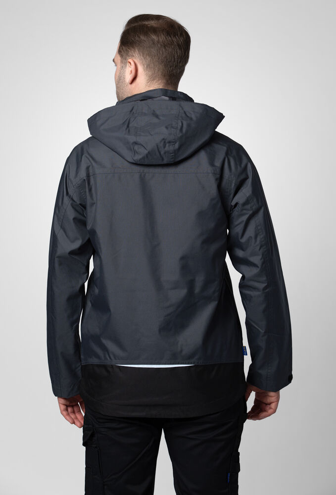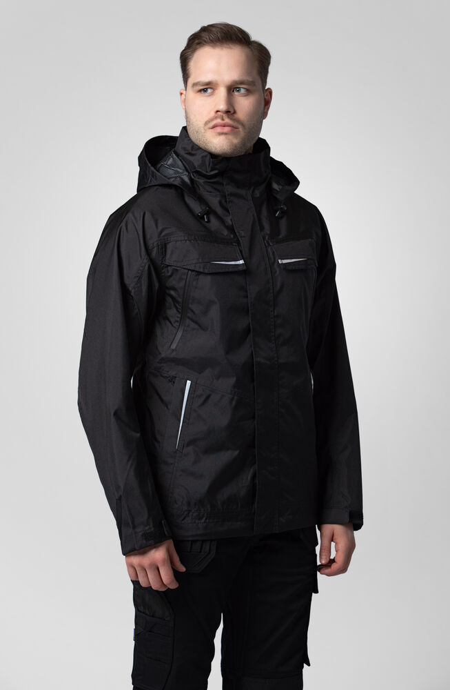 Vind- og vanntett skalljakke med teipede sømmer. To-veis glidelås i front med klaff og trykknapper som beskytter mot regn og vind. Doble brystlommer, to med klaff og borrelås og to med vanntette glidelåser. ID-kortholder på ventre side. Sidelommer med glidelås og fleecefôr. Tre romslige innerlommer, to med glidelås. Avtagbar justerbar hette med snor. Justerbare mansjetter med borrelås, og justerbar midje med snøring. Fôr kan åpnes for enklere å trykke og brodering.