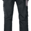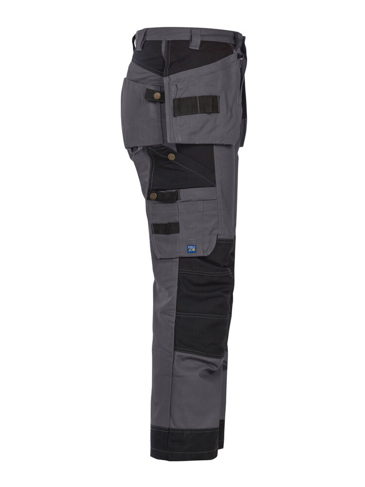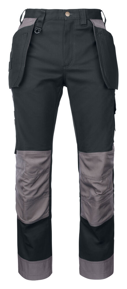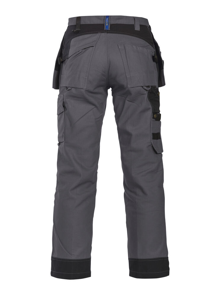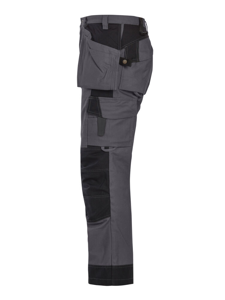 To hengende spikerlommer som kan puttes bort, en med ekstra lommer og en med verktøyshemper. Spikerlommene er forsterket med 100% Cordura®. Lommer på låret til telefon, penn- og verktøy. To regulerbare hammerhanker. To D-ringer. Tommestokklomme med lomme til verktøy og knivknapp. Knelommer i Cordura®, åpning fra innsiden og regulerbar høyde på knebeskyttelsene. Forbøyde knær. Forsterket neders på buksen med Cordura®. Romslige baklommer. Klaff på venstre baklomme. Baklommer og benlommer har hemper for Inbags. Feste for ID-kortsholder.
