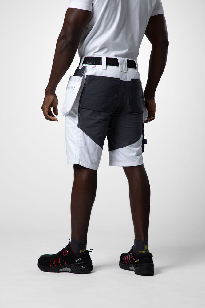 Funksjonsshorts med stretchpanel over setet. Bredere beltehemper på baksiden for å unngå trykk fra beltet i bakenden. Hengelommer, forsterket på innsiden med Cordura®. Sidelommer. Benlommer med glidelås og indre D-ring, i tillegg til åpne lommer på begge sider for telefon og verktøy.