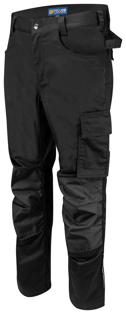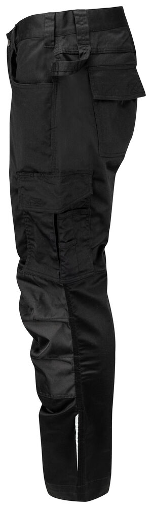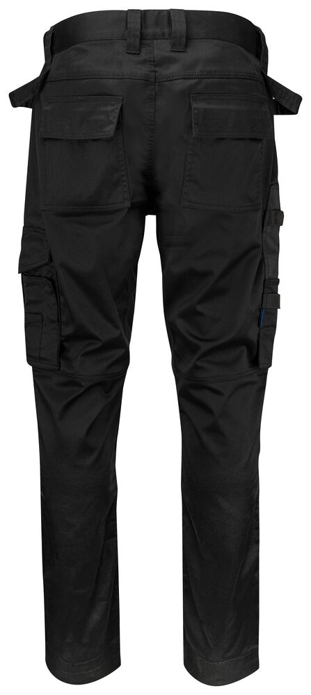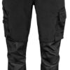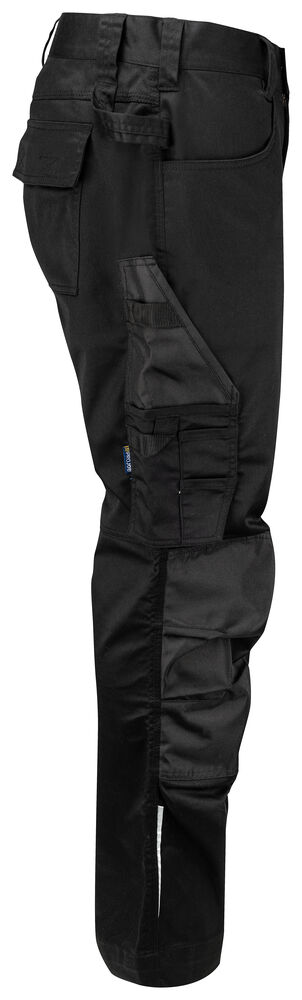 Midjebukse i stretchmateriale for god fleksibilitet. 4-veis stretchpanel i skrittet for økt komfort. Sidelommer. Baklommer med klaff og borrelås. Lomme for tommestokk og verktøylomme med knivknapp. To hammerløkker, en på hver side. Reflekterende print på utsiden av bena. Forbøyde knær med innvendige lommer for knebeskyttere. Disse er justerbar i to høydenivåer. Forsterkninger i tommestokklommene og over knærne for økt slitestyrke. Størrelse C42-C64 kan forlenges med 5 cm.