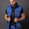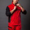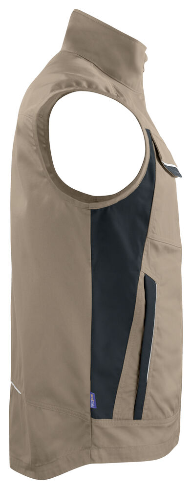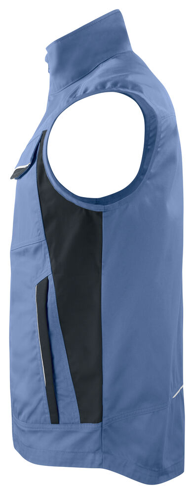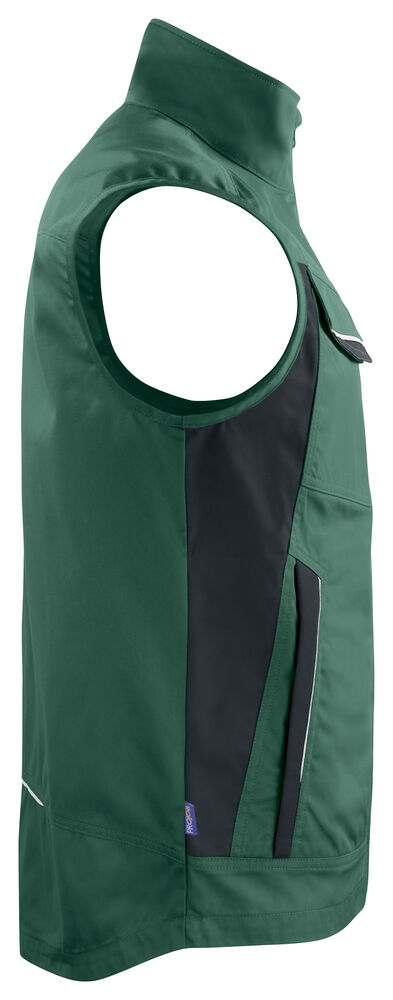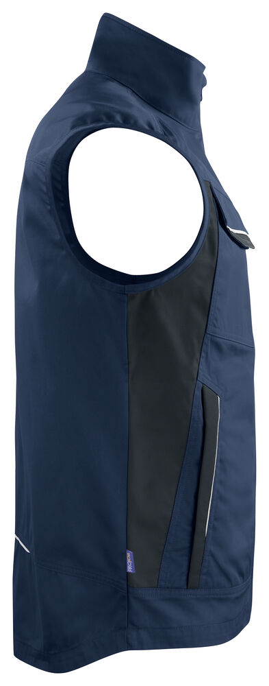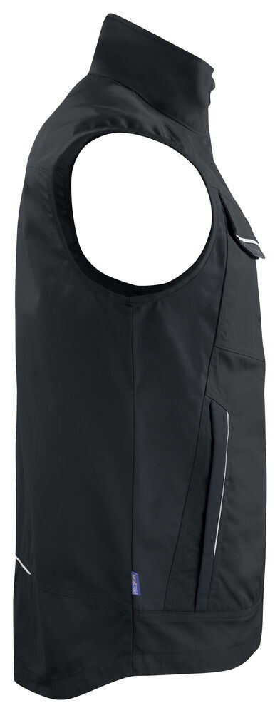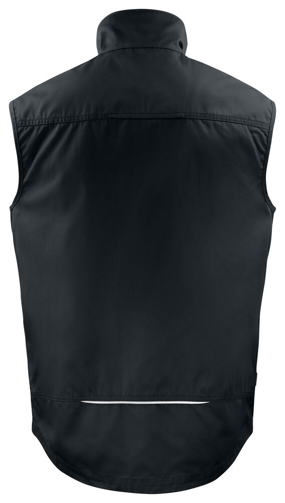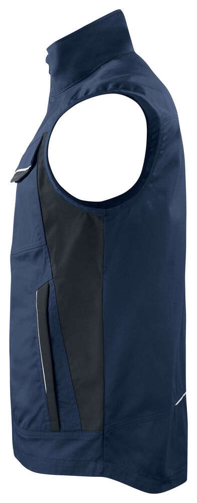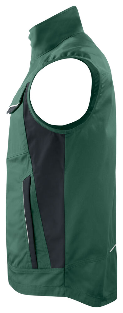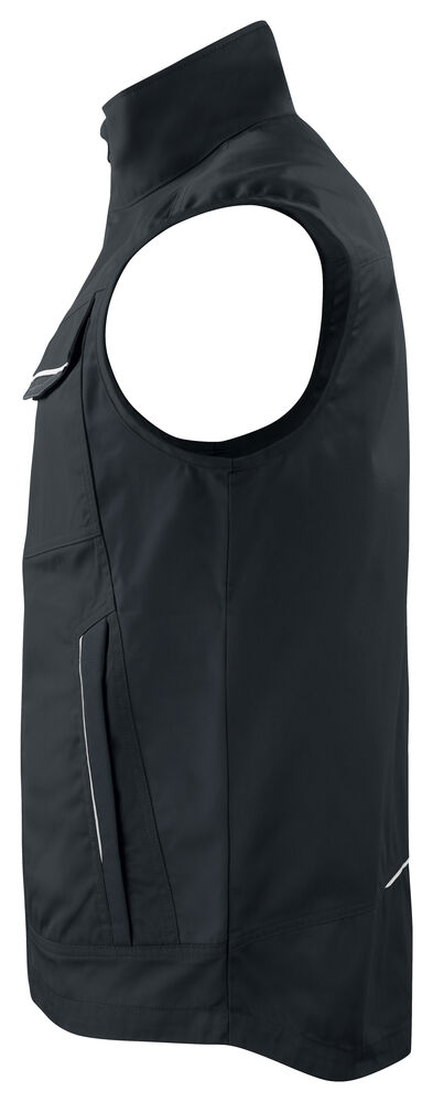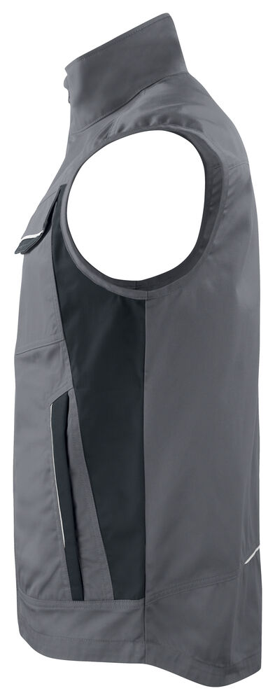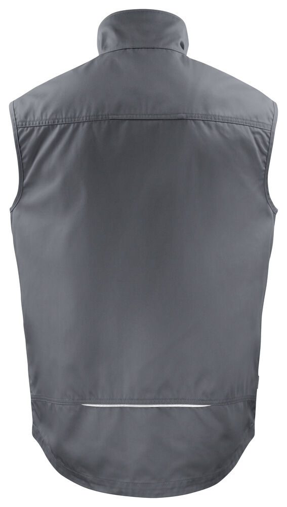 Vest i polyester/bomull. To brystlommer, D-ring i venstre brystlomme til ID-kort. Glidelås i kragen med innvendig vindklaff. Innsydde frontlommer med glidelås og forsterket kant. To innerlommer hvorav en for mobiltelefon. Reflekser foran og bak. Forlenget rygg.
