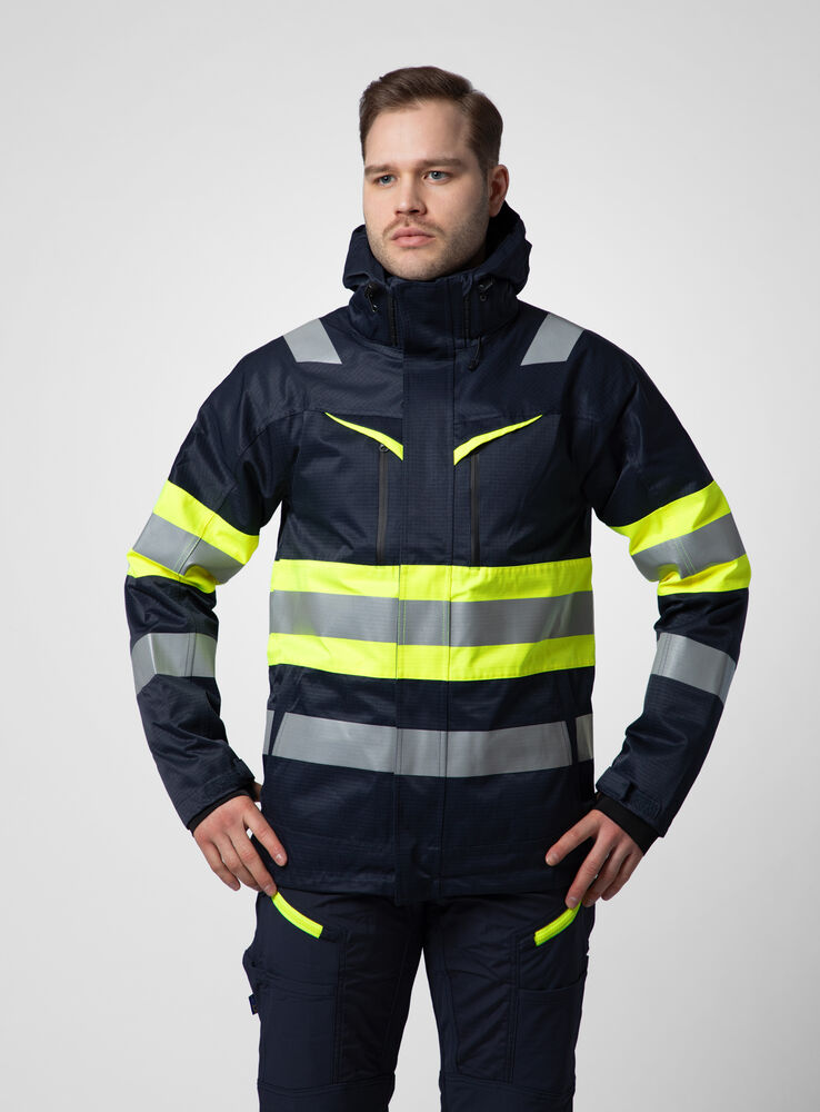 Vind- og vanntett vattert jakke med teipede sømmer i rip-stop materiale. Toveis glidelås foran med klaff for å hindre vindtrekk og vanninntrenging. Klaffen lukkes med trykknapper. Brystlommer på begge sider med glidelås. Venstre brystlomme med innvendig brakett for ID-kort. Sidelommer med glidelås. Innvendige lommer på begge sider med glidelås, på venstre side har den en åpen lomme med borrelås. Avtagbar hette. Hetten er justerbar med snøring. Justerbare mansjetter med borrelås. Mansjettene har tommelgrep. Justerbar snøring i kanten. Fôr kan åpnes for å forenkle trykk.