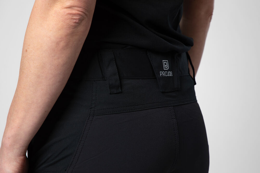 Arbeidsbukse med god fleksibilitet. Stretchstoff over sete, skritt og kne for å gi ekstra bevegelsesfrihet, også innsydd stretch i sidene øverst for komfort. Ventilasjonsåpninger med glidelås langs begge bensider med meshfôr. Benlommer med glidelås på begge sider med utvendige lommer for verktøy. Begge sider med innvendig telefonlomme, samt innvendige hemper for feste av ID-kort. Høyre sidelomme for tommestokk og lomme for verktøy med knivknapp. Bredere belteløkke bak for å hindre press fra beltet. Skjult feste for hylsterlommer (ref. artikkel 9042). Forbøyde knær. Innvendige lommer for knebeskyttere, justerbar i to høydenivåer. Ved å fjerne den røde sømmen i falden kan buksen forlenges med 5 cm.