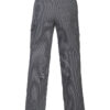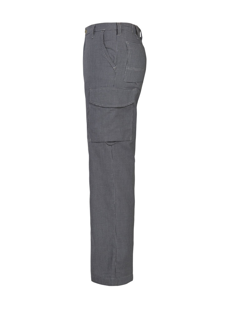 Kokkebukse uten frontfold. Sidelommer i front, sikkerhetslomme med glidelås på høyre side. To utenpåliggende baklommer. To lårlommer, den høyre for palett og pinsett. Den venstre med klaff og en innvendig telefonlomme. Elastisk i midjen.