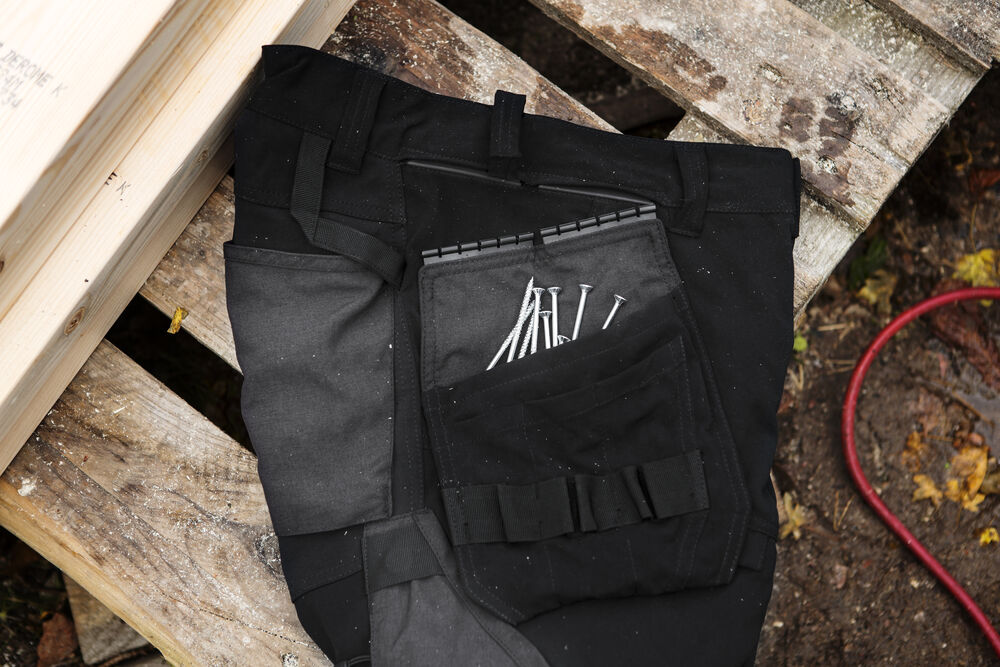 - 65% polyester, 35% bomull. Forsterkninger: 100% polyamid.