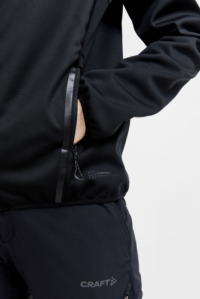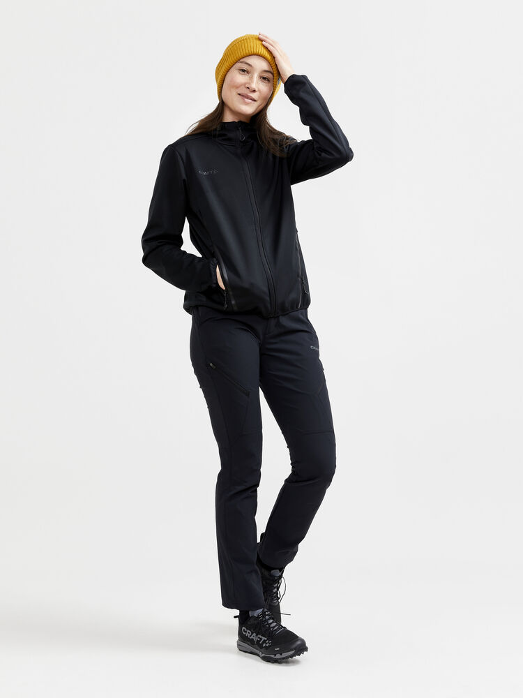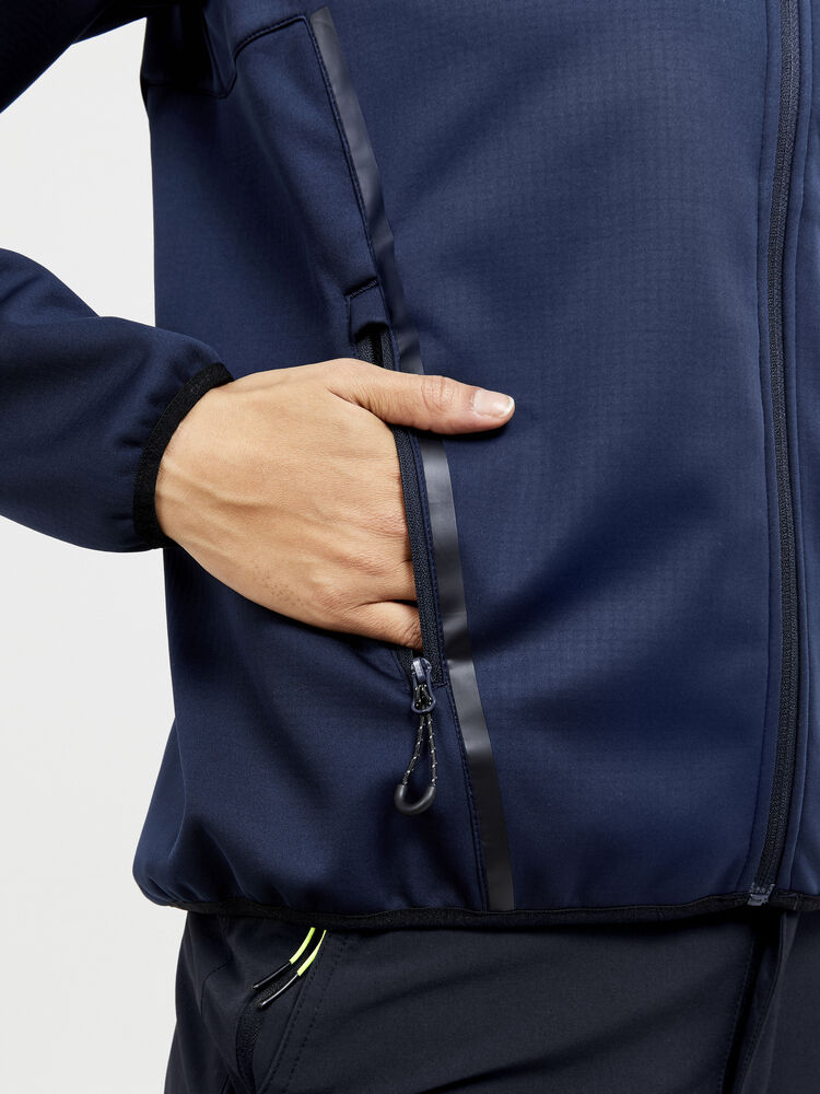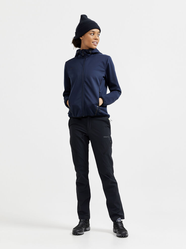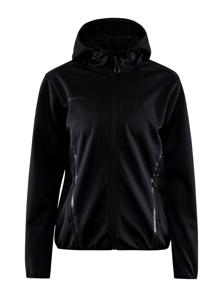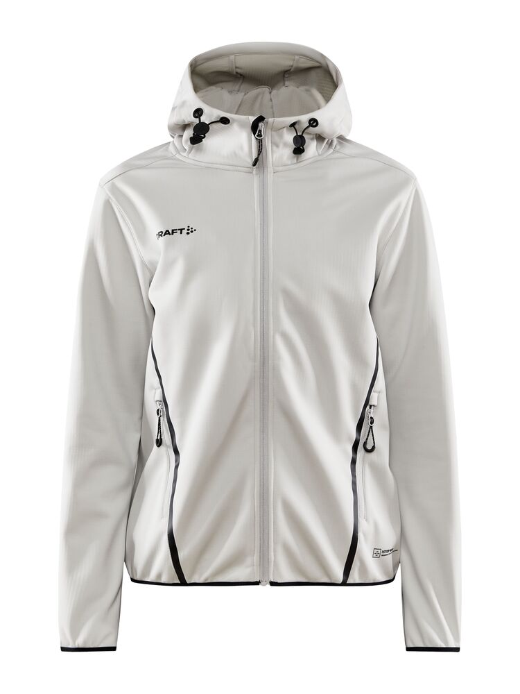 Avansert softshelljakke til dame i resirkulert og vindbeskyttende materiale med myk børstet innside, god stretch og teipede detaljer. Jakken har to sidelommer med glidelås, innerlomme med glidelås, justerbar hette og elastisk strikk i nederkant og i ermet.