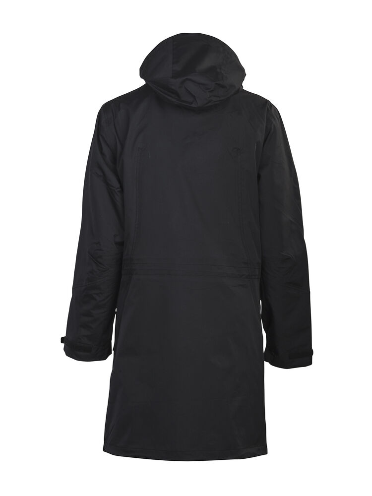 Lang og glatt allværsparkas som er vind-og vanntett og pustende med tapede sømmer (WP3000/MVP3000) og mesh fôr. Forlenget i ryggen, snor i rygg og nederkant. Forbøyde ermer med borrelåsjustering. Høy krage med avtagbar hette. To ytre lommer, en brystlomme og to innerlommer med hodetelefonutgang.