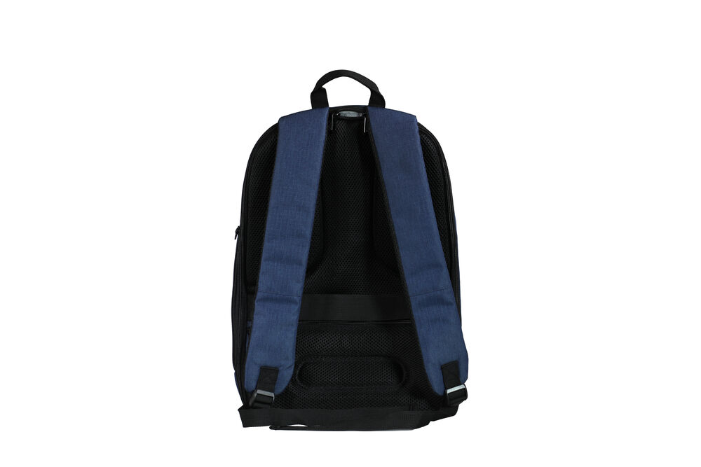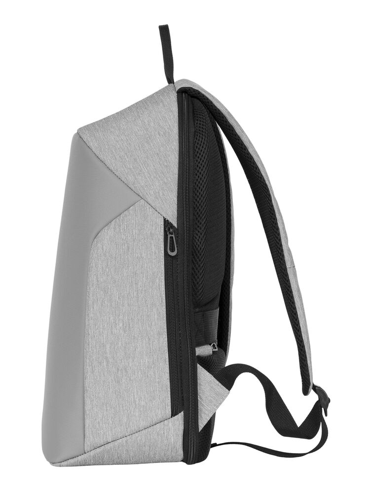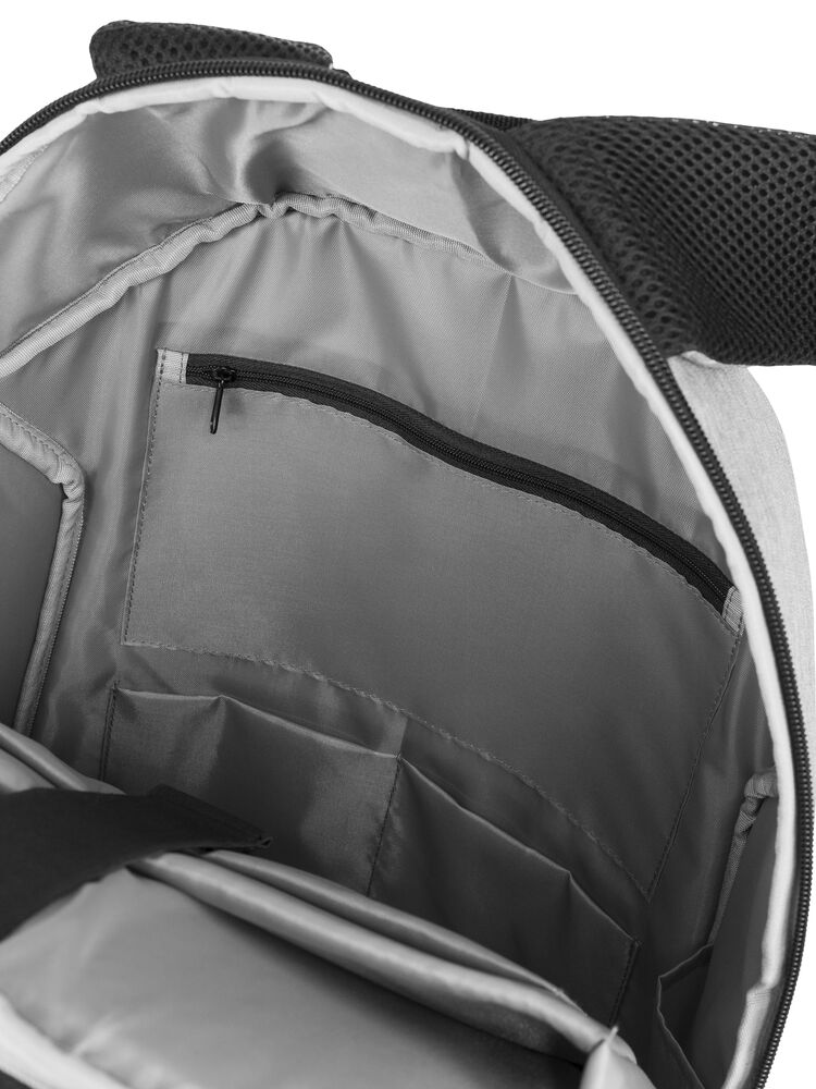 Glidelås til åpning av hovedrom er inn mot rygg. Lomme med glidelås på bakside mot rygg for trygg oppbevaring av verdisaker. Det er også en lomme med glidelås i siden. God polstring og myk mesh i rygg, samt bærestropper. Innvendig er det lyst grått fôr av nylon. Eget rom til bærbar pc opp til 17 tommer.