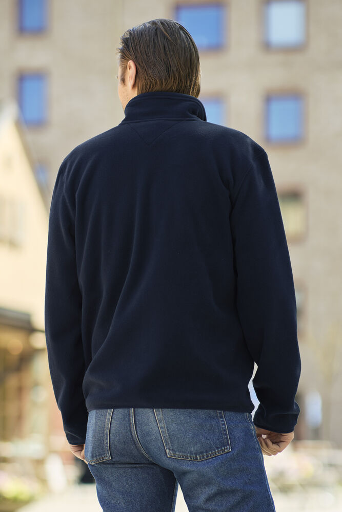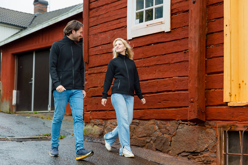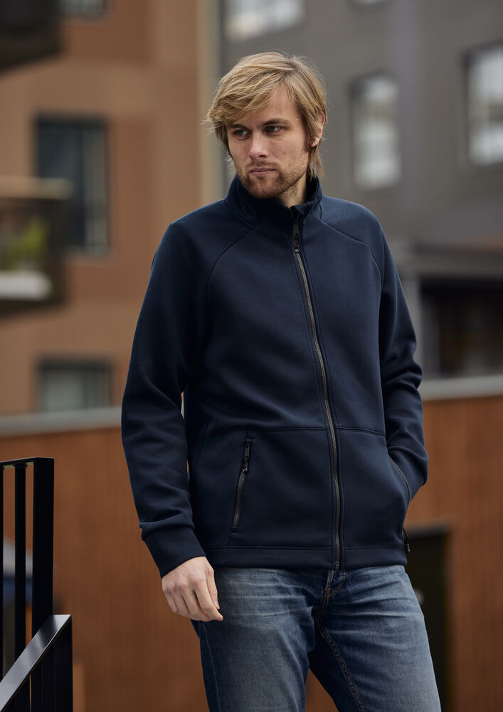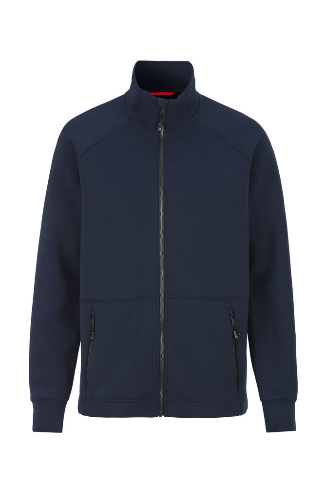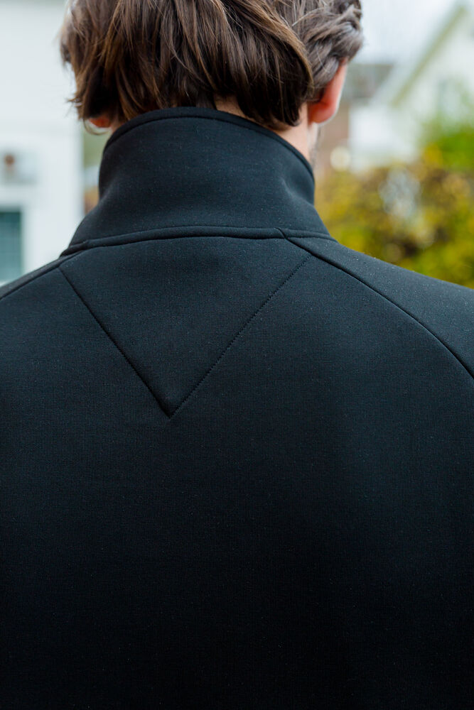 Genser laget i et dobbeltstrikket materiale med ekstra stretch. Genseren er laget av et blandemateriale med bl. annet sertifisert resirkulert polyester. Sydde mansjetter i nederkant og ermeavslutninger. Formet dobbel krage. Glidelås som går opp i kragen og frontlommer med dekorative, sorte glidelåser. Genseren har raglanermer og litt lengre rygg, noe som gir en svært god passform.