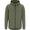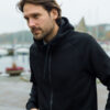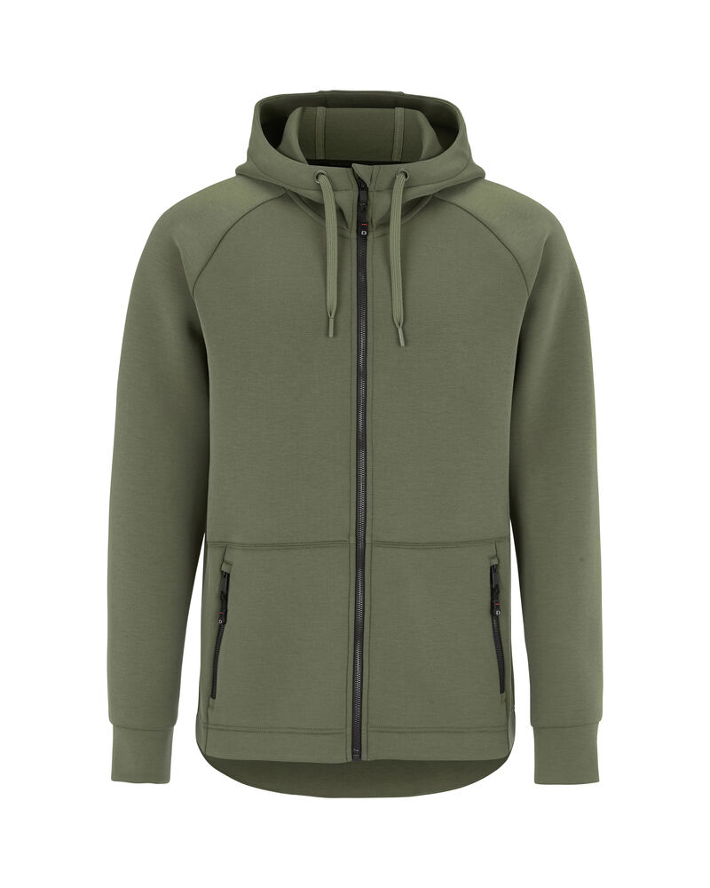 Hettegenser laget i et dobbeltstrikket materiale med ekstra stretch. Hettegenseren er laget av et blandemateriale med bl. annet sertifisert resirkulert polyester. Sydde mansjetter i nederkant og ermeavslutninger. Formsydd hette med doble sømmer og snøring. Glidelås som går opp i kragen og frontlommer med dekorative, sorte glidelåser. Hettegenseren har raglanermer og litt lengre rygg, noe som gir en svært god passform.