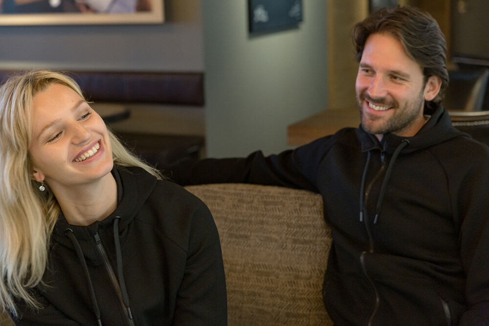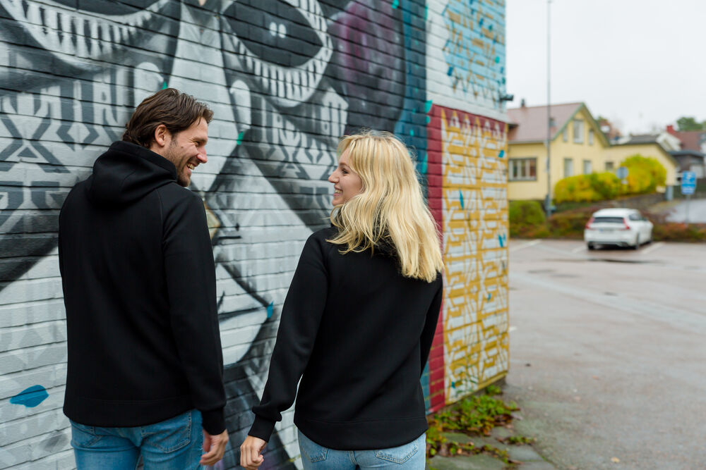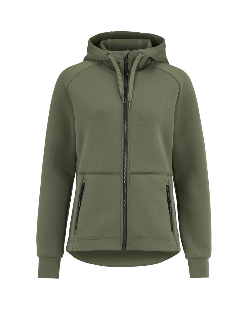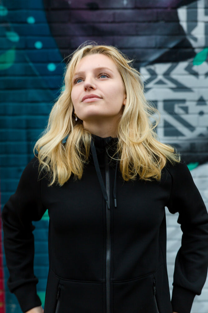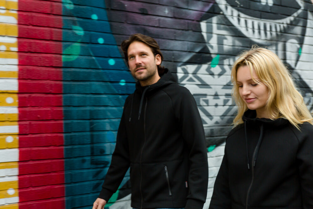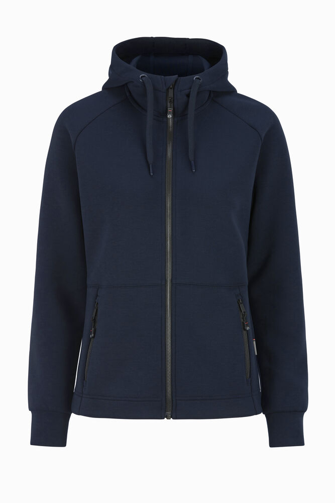 Hettegenser laget i et dobbeltstrikket materiale med ekstra stretch. Hettegenseren er laget av et blandemateriale med bl. annet sertifisert resirkulert polyester. Sydde mansjetter i nederkant og ermeavslutninger. Formsydd hette med doble sømmer og snøring. Glidelås som går opp i kragen og frontlommer med dekorative, sorte glidelåser. Hettegenseren har raglanermer og litt lengre rygg, noe som gir en svært god passform. Noe innsvinget modell.