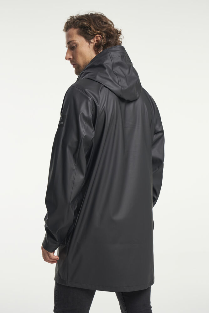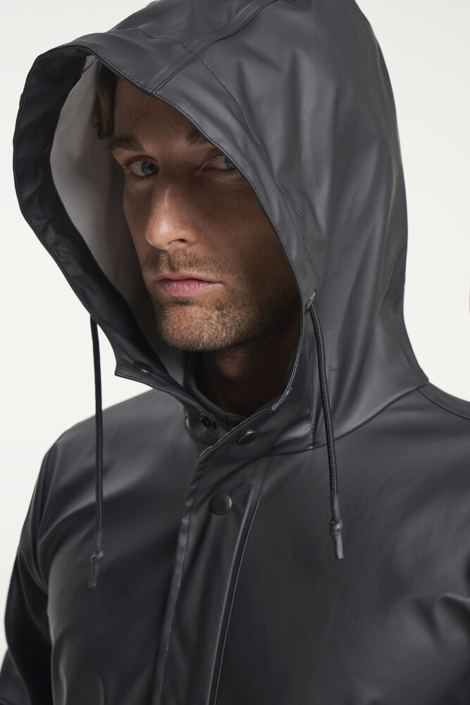 Apelviken PU regnfrakk har et klassisk design i en rett silhuett med mykt jerseystoff på innsiden. Jakken har glidelåslukking og knapper i front, justerbare mansjetter og en splitt i ryggen som gir deg full bevegelsesfrihet. Regnfrakken har vanntetthetsgrad på 5000 mm, en komfortabel, fast hette og forseglede sømmer som holder deg tørr.