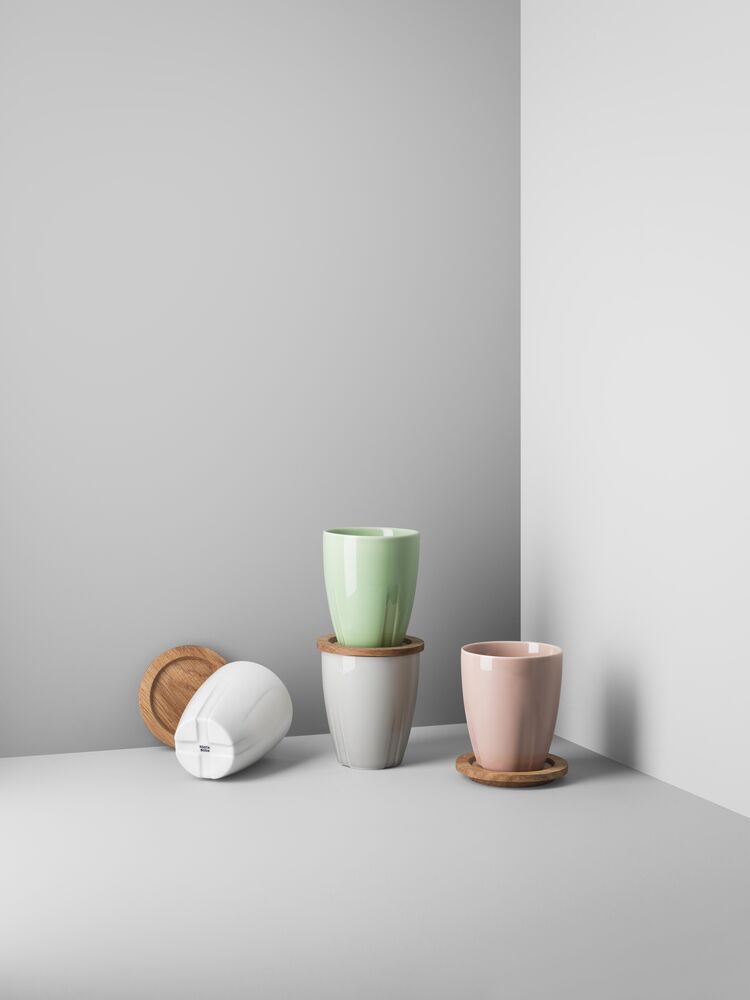 Bruk seriens vakre porselenskrus finnes i flere farger og leveres med et praktisk lokk som holder varmen lenger og som beskytter bordet.