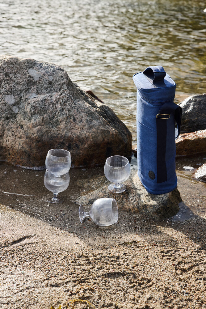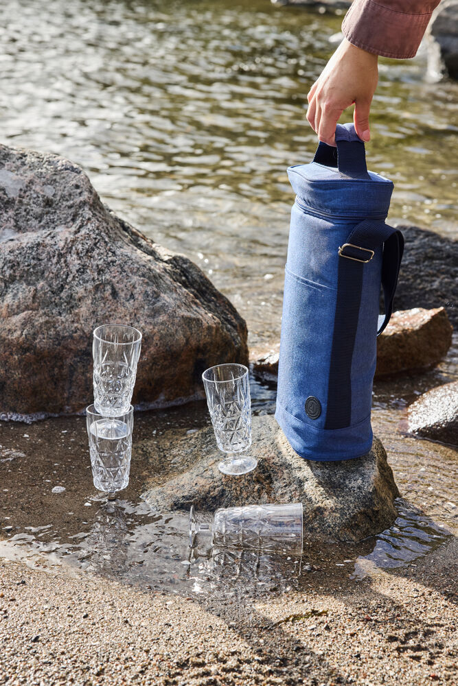 Praktisk og sporty kjøleveske i en høyere modell. Laget av blått rPET-materiale med fine, kontrastfargede detaljer. Denne litt høyere kjølevesken passer perfekt til – for eksempel – to vinflasker eller 1,5 liters PET-flasker. Har både bærehåndtak og justerbar skulderstropp.
