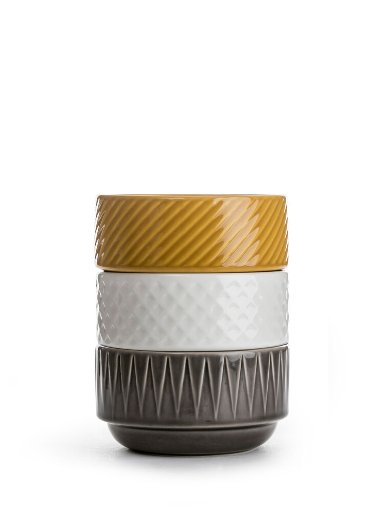 Skål med karakteristisk relieff. Skålen er en del av serien Coffee & More, utviklet av Sagaform i samarbeid med designeren Margot Marolo. Seriens design er en flørt med 70-tallets direkte, lekne og klare språk. Serien finnes i ulike deler, mønster og farger og gjør seg best i en herlig blanding av alt! Tåler mikrobølgeovn og maskinoppvask.