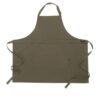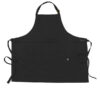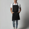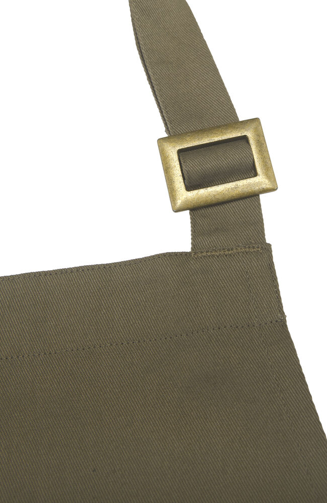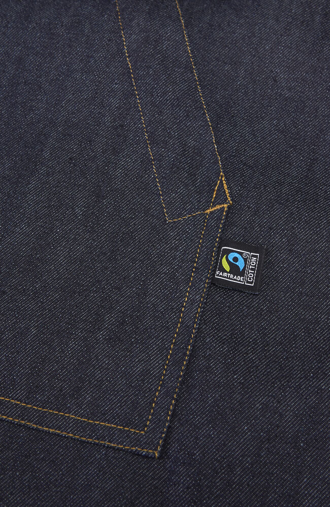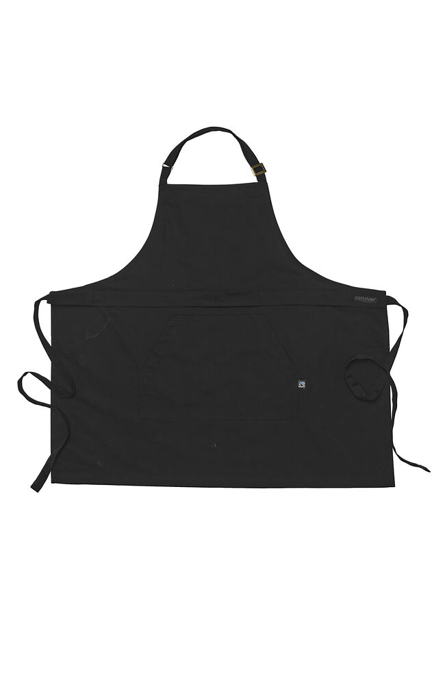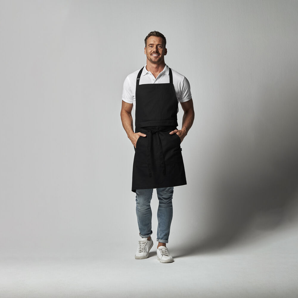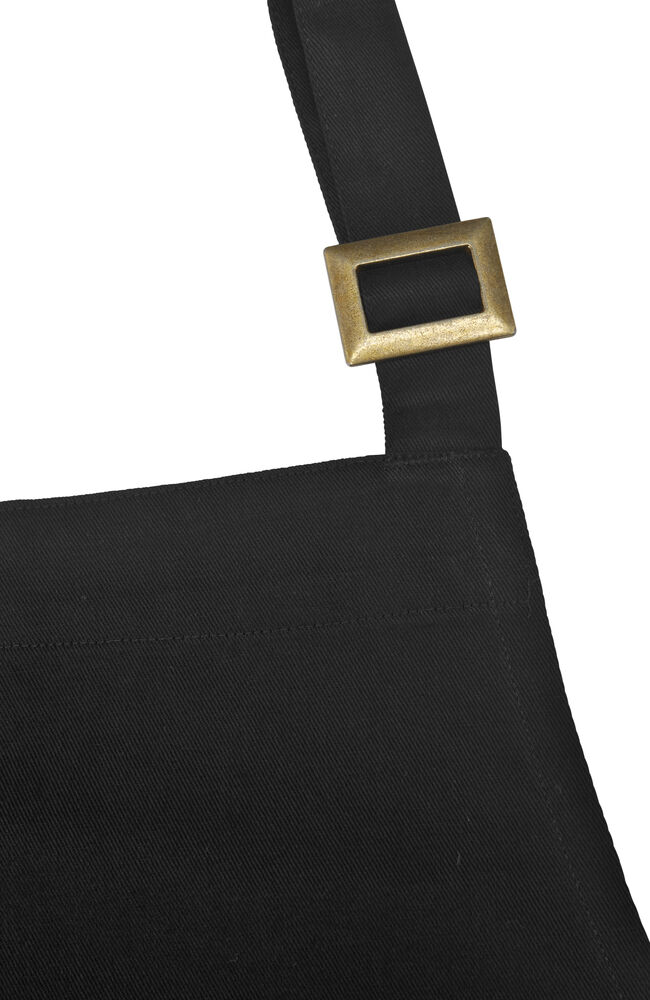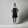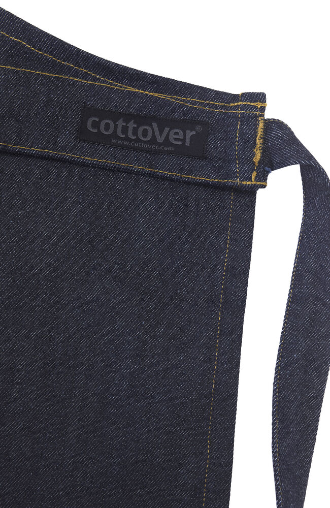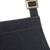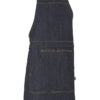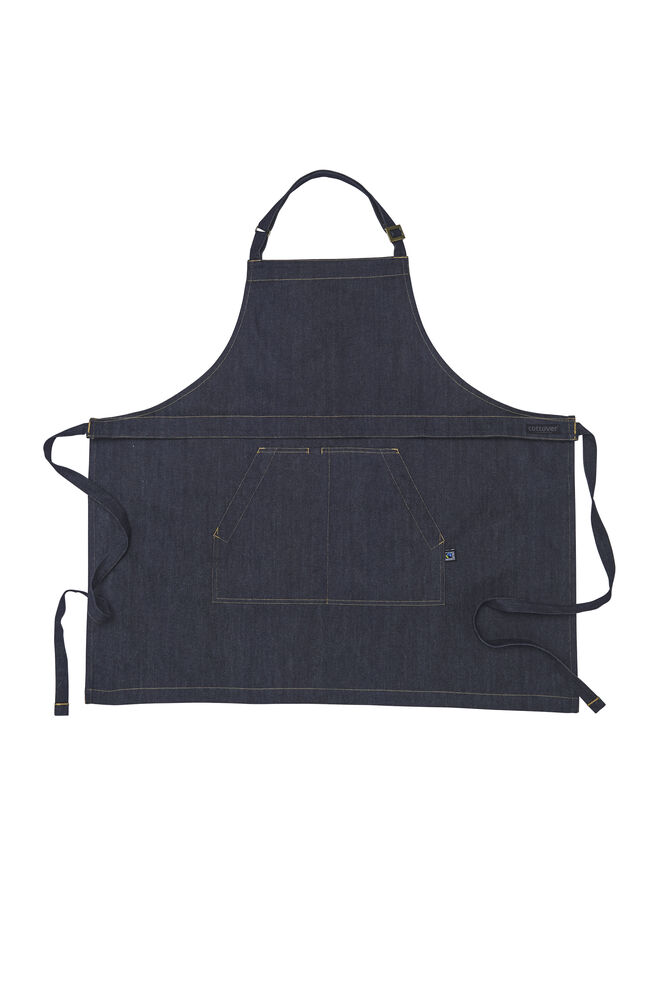 Brukes som brystforkle med justerbar nakkestropp, eller som midjeforkle da smekken kan brettes ned og skjules. Ton-i-ton sømmer. Forkledet i denim har gule sømmer.