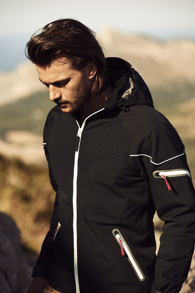 Vind- og vanntett funksjonsjakke i sportslig modell. Teipede sømmer, vanntette glidelåser og lett vattering. Regulerbar, avtagbar hette, samt ventilasjon under ermene. Elastisk snorstrammer i hette og nederkant, samt regulerbar mansjett. Herremodell. Wp 3000/ Mvp 3000