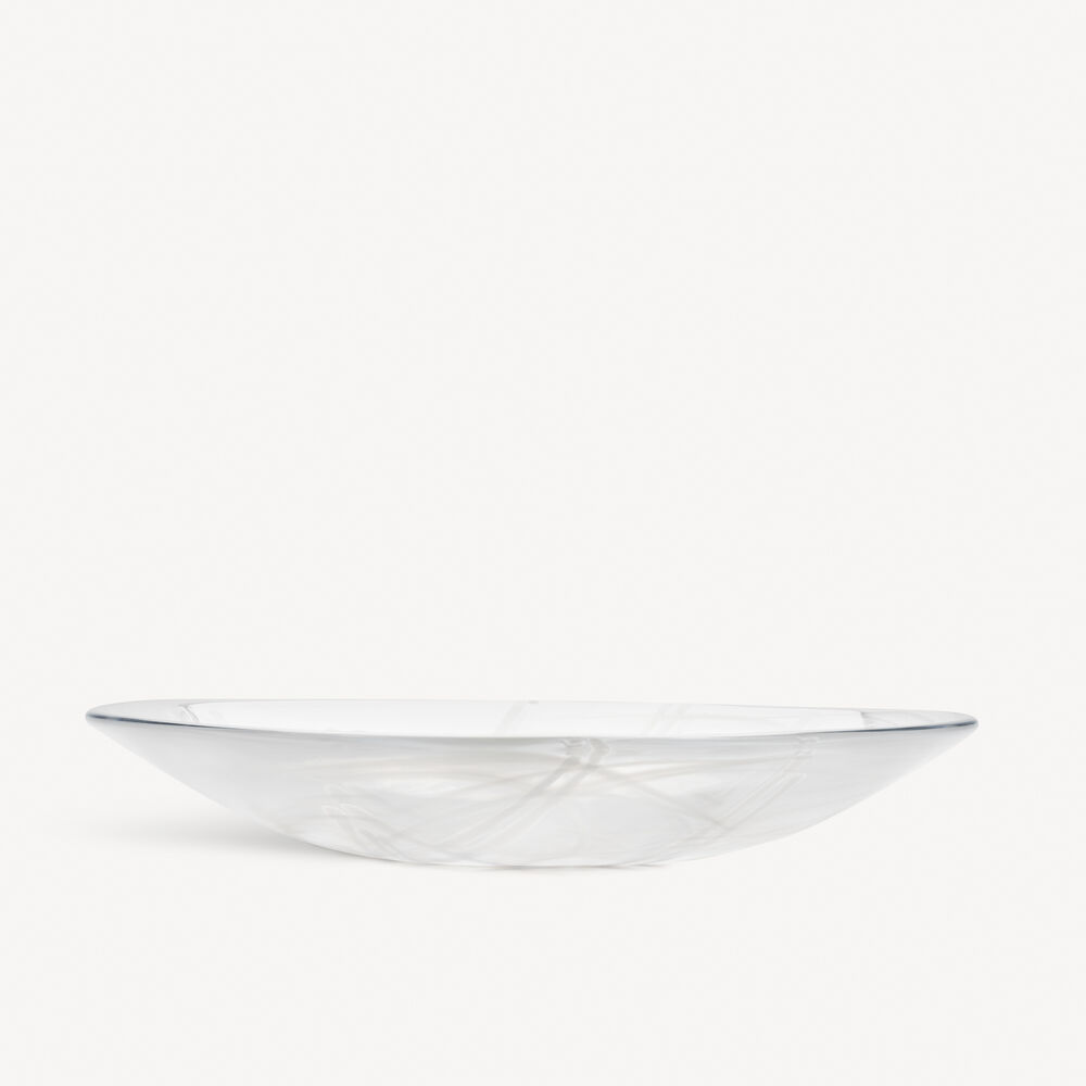 Contrast fra Kosta Boda er laget ved hjelp av en teknikk som kalles sentrifugering, som skaper et slør av farger inne i glassmassen. I kombinasjon med fargede glasspinner som tilsettes i prosessen, blir hvert produkt unikt. Det store fatet i serien er perfekt til servering av fingermat eller som fruktfat. Design Anna Ehrner.