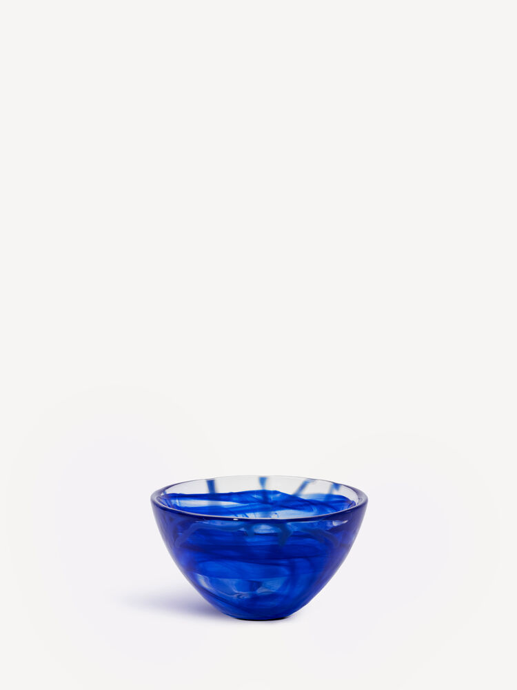 Contrast-serien fra Kosta Boda er produsert ved hjelp av en teknikk som kalles sentrifugering. Teknikken ble oppfunnet i det smålandske glassriket på 1950-tallet og skaper fargeslør inne i glassmassen. I kombinasjon med fargepulver og glasspinner som tilsettes under prosessen, er hvert produkt unikt. Den lille blå/blå skålen er vakker i seg selv – men kan med fordel brukes som en fruktskål eller lignende. Design Anna Ehrner.