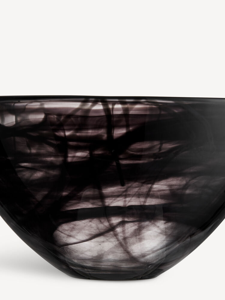 Contrast fra Kosta Boda er laget ved hjelp av en teknikk som kalles sentrifugering, som skaper et slør av farger inne i glassmassen. I kombinasjon med fargede glasspinner som tilsettes i prosessen, blir hvert produkt unikt. Den store bollen er fin i seg selv – eller kanskje som fruktskål? Design Anna Ehrner.