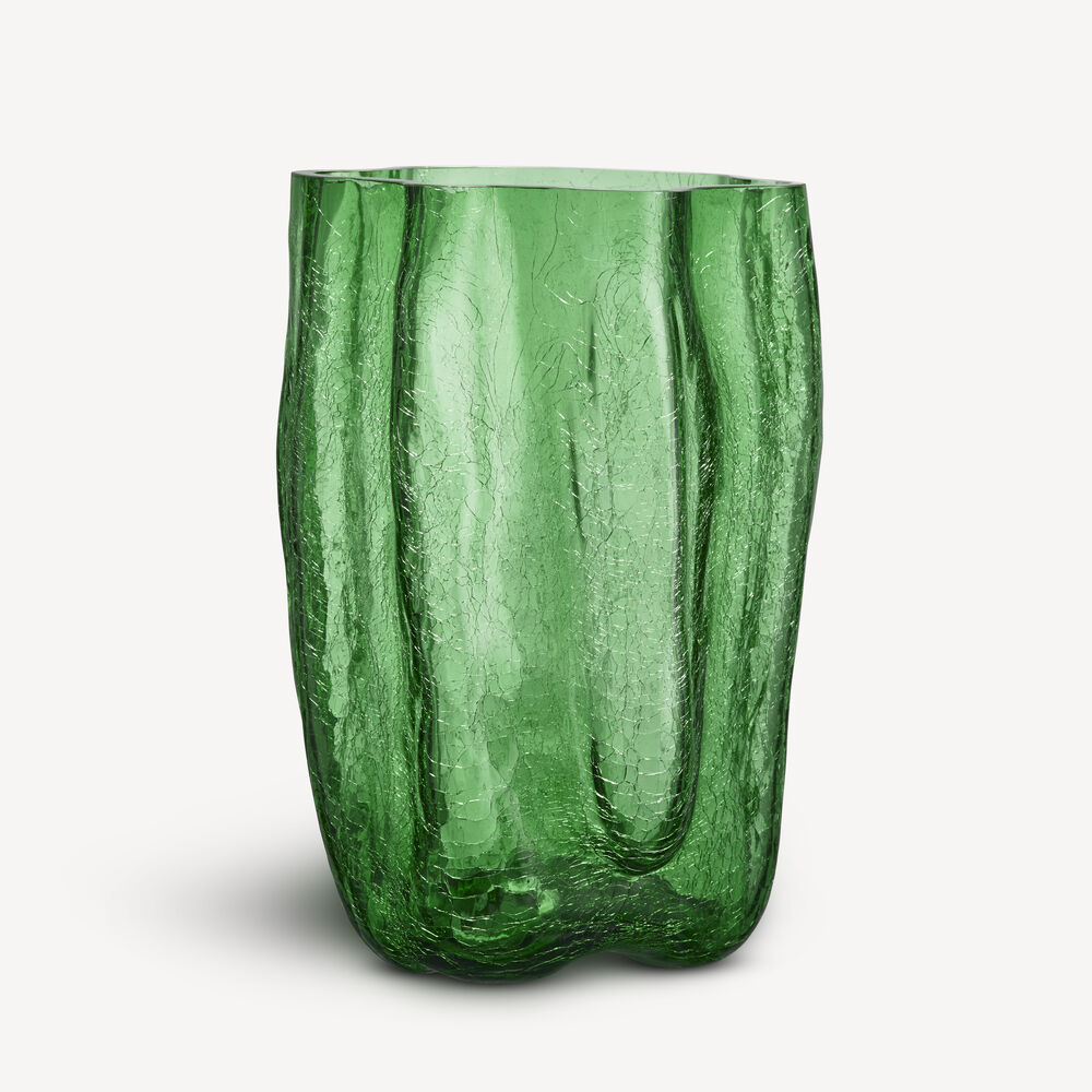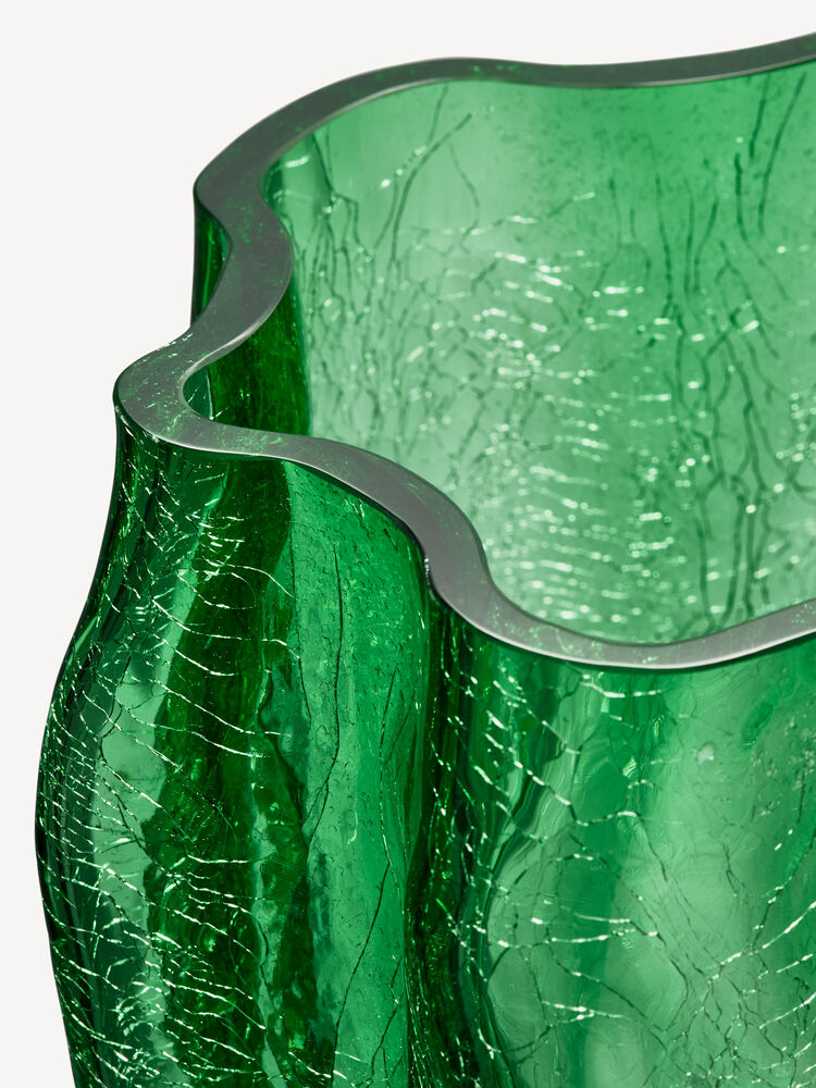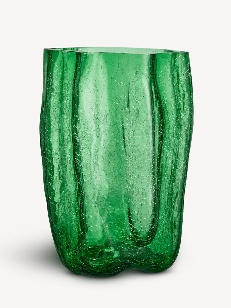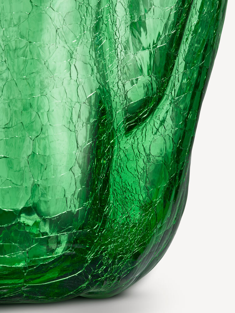 Knatring og torden – et magisk vidunder. Hos Kosta Boda undrer vi oss over vakkert bevarte sprekker i glass. Den grønne vasen fra Crackle-kolleksjonen har et uttrykksfullt, skulpturelt ytre laget med en gammel håndverksteknikk der det varme glasset dyppes i iskaldt vann. Den krakelerte overflaten reflekterer dagslyset og avslører historiene om ild, jord og vann. Vasen er munnblåst i Kosta og designet av Åsa Jungnelius.