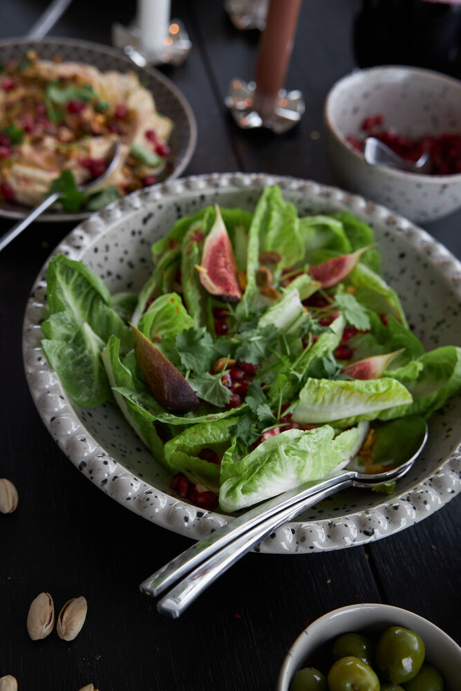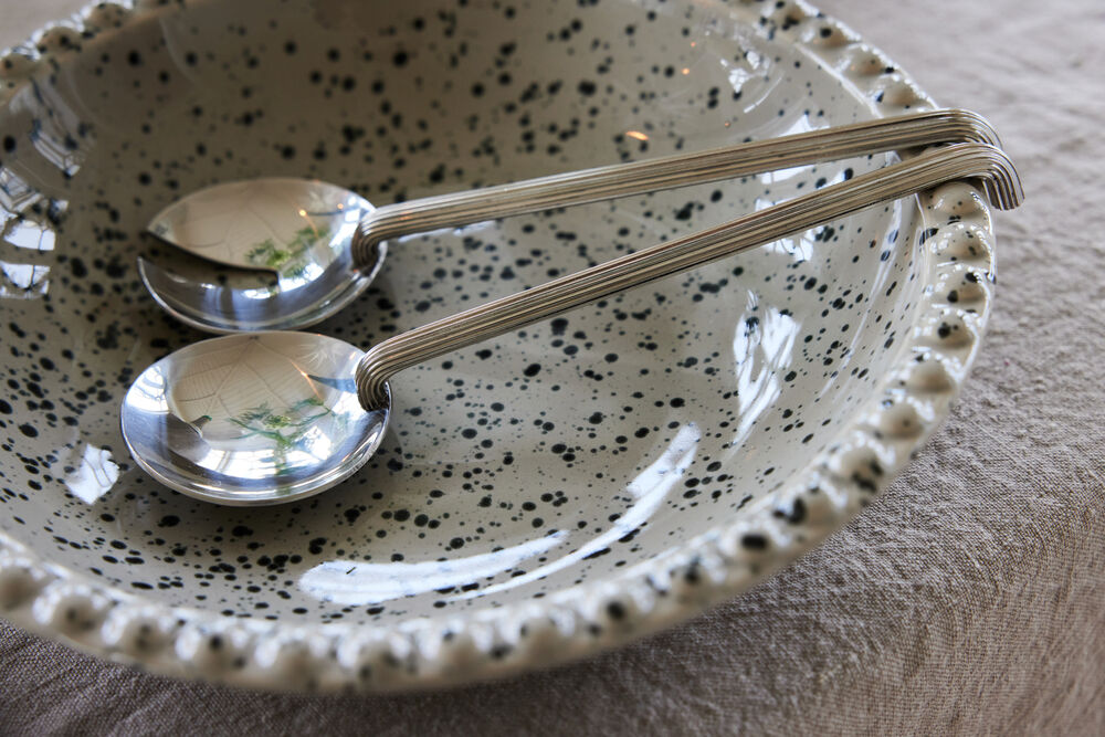 En større serveringsskål til salater, brød eller fruktsalater. Fargen er i en beige/grå tone med et fint sprutmønster i sort. Kanten er dekorert med små, runde opphøyninger. Skålen er laget av steingods og kan enkelt kombineres med Coffee & More-serien. Ditte er håndlaget – farge og overflate kan derfor variere fra et produkt til et annet. Hvert produkt er unikt i sitt slag.