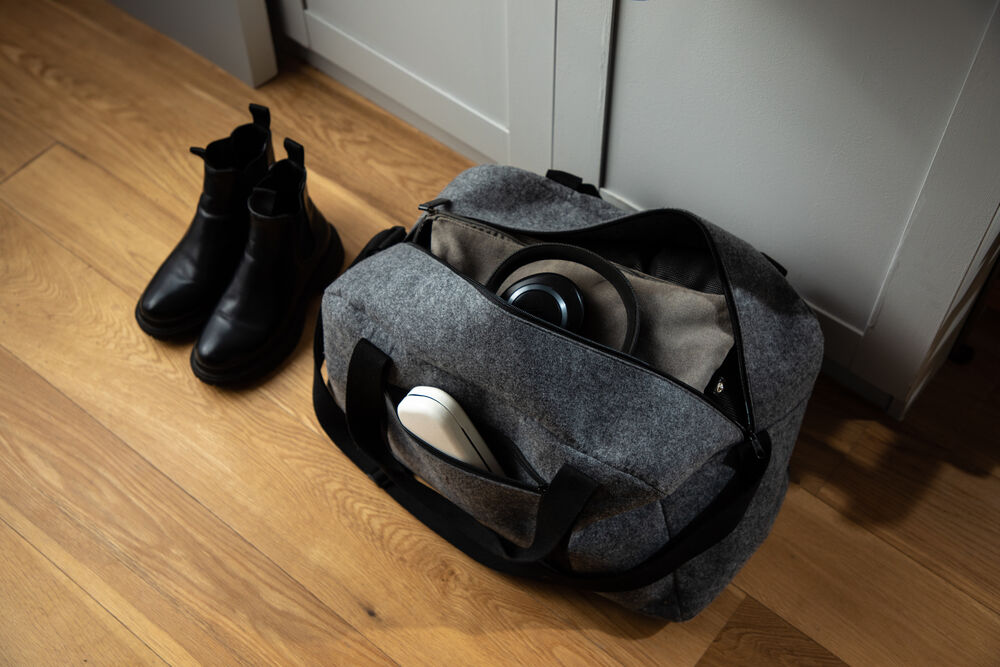 Oppdag vår praktiske og miljøvennlige duffelbag i grått filtstoff laget av 100 % R-PET. Bagen har to mindre rom, ett foran og ett på kortsiden, begge utstyrt med glidelåser for å sikre innholdet. Den stabile basen med plastknotter og den store lagringskapasiteten gjør den perfekt både for reiser og daglig bruk. Kan bæres med enten skulderreim eller håndtak.