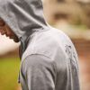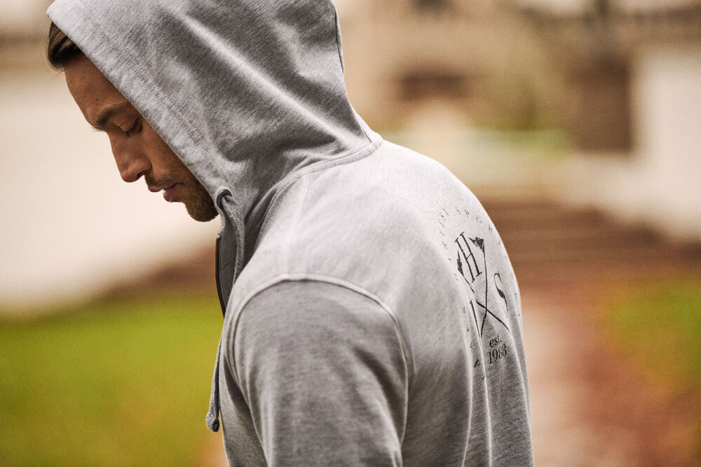 Hettejakke med metallglidelås i front og på sidelommene. Justerbar snor i hetten.