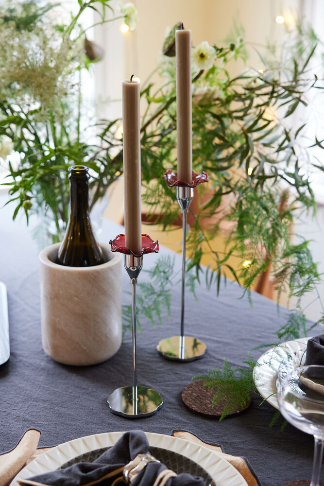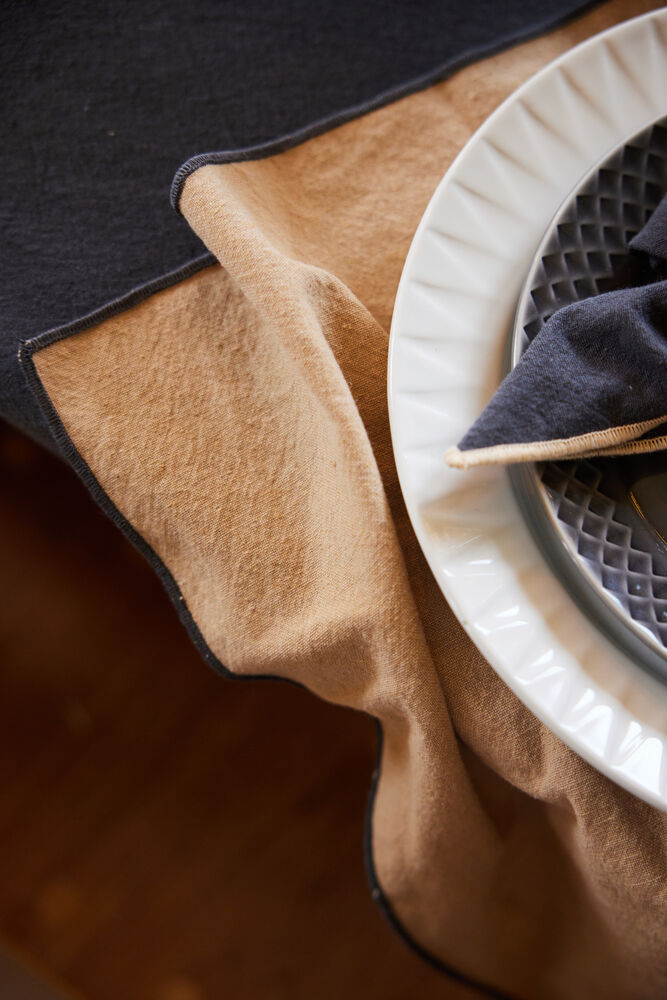 Oppdag duken Edith, en tidløs klassiker med en sjarmerende kontrastkantsøm som gir et vakkert og dekorativt preg til borddekningene dine. Denne duken gir en myk og varm følelse som er perfekt for alle sesongmessige anledninger og fester, og gjør borddekningen komplett. Finnes i to fargekombinasjoner med base i grå eller beige, som harmonerer vakkert med resten av kolleksjonen. Kompletter med matchende servietter og en rund duk for en enhetlig stil. Mål: 150×280 cm. (70 % resirkulert bomull og 30 % resirkulert polyester.) Design Sagaform studio.