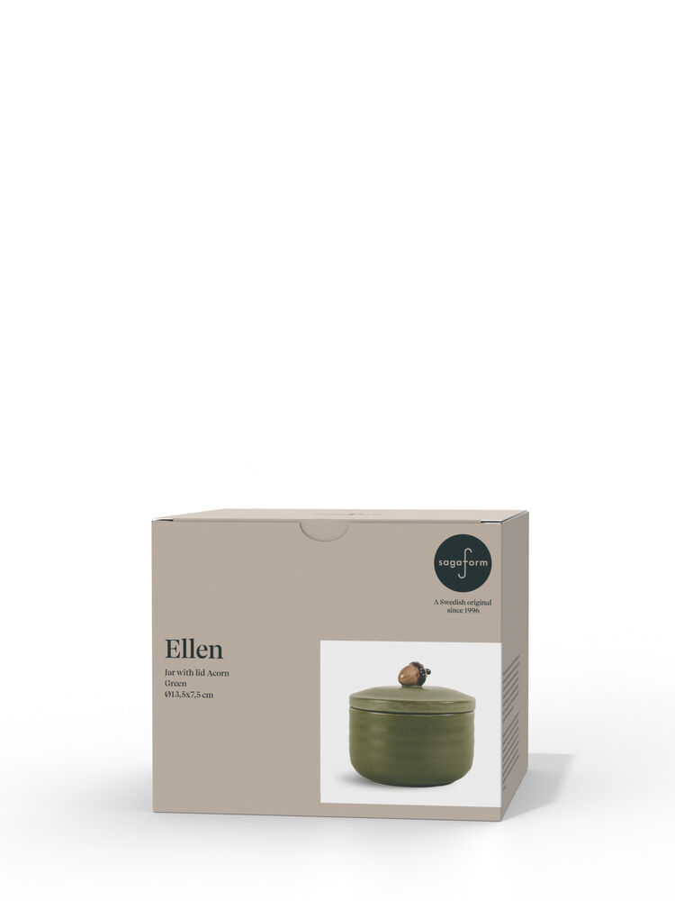 Krukker er perfekte gjemmesteder for ting du vil ha i nærheten, men som ikke alltid er så dekorative – eller som oppbevaring for ting du vil servere raskt, enkelt og pent. Ellen-krukken fungerer usedvanlig godt på kjøkkenet, men like godt på badet eller barnerommet. En søt krukke som kommer i to naturlige farger, grønn og off-white. Finnes i to størrelser, der den store krukken har et ekorn på lokket og den lille har en eikenøtt. Laget av steintøy.