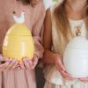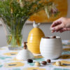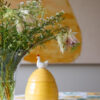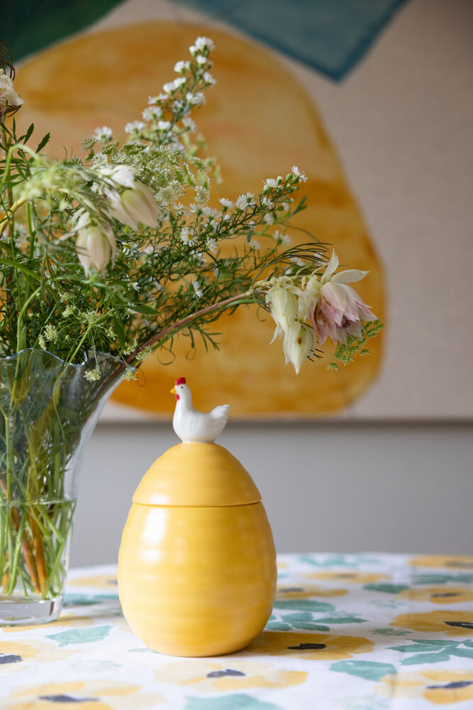 Krukker er perfekte gjemmesteder for det du vil ha i nærheten. Ellen krukke med lokk er selvsagt ikke dårligere. Før påske fyller vi den med søtsaker eller småkaker, gir den bort i gave eller beholder den for oss selv. Vi bruker den også som oppbevaring til ting vi ønsker å servere raskt, enkelt og pent. Ellen-krukken fungerer usedvanlig godt på kjøkkenet, men også på badet eller på barnerommet. En søt krukke som kommer i gult, dekorert med en høne på toppen. Krukken finnes også i offwhite farge dekorert med en hare. Laget av steingods. Leveres i gaveeske. Rommer 60 cl. Krukken tåler oppvaskmaskin, noe som forenkler rengjøring og vedlikehold.