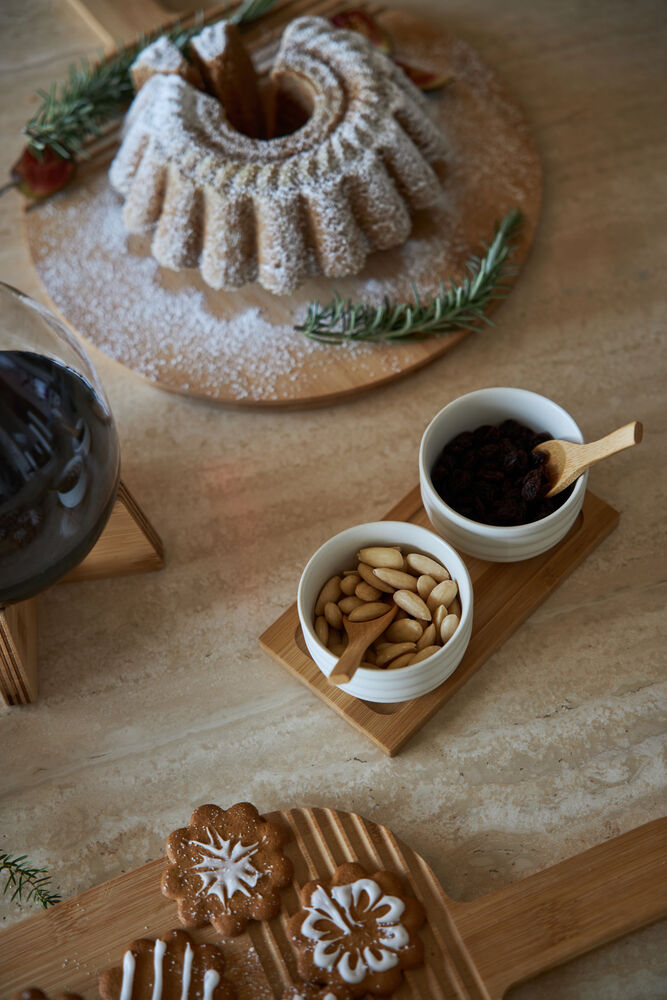 Ellen skålsett inneholer to små skåler og to skjeer på et fint lite brett av bambus. Skålene er laget av steingods i en naturlig beige farge. Perfekte små skåler til gløggtilbehør eller andre ting resten av året.