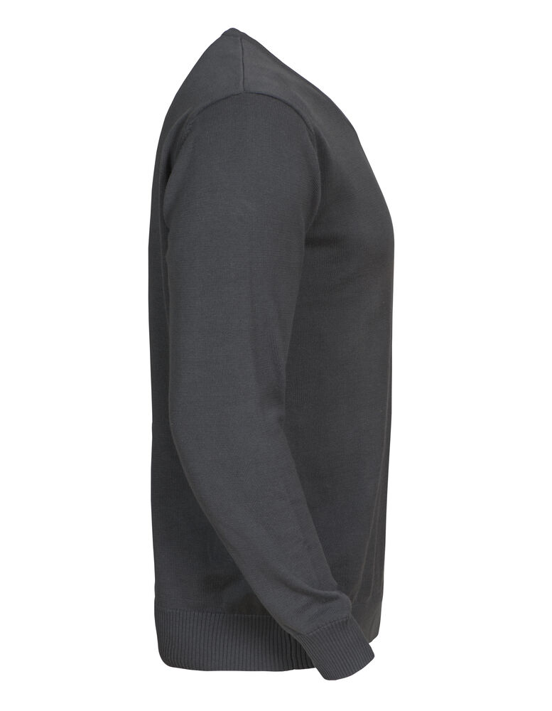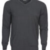 Strikket genser med V-hals. 1×1 ribb i nederkant og i ermavslutning.