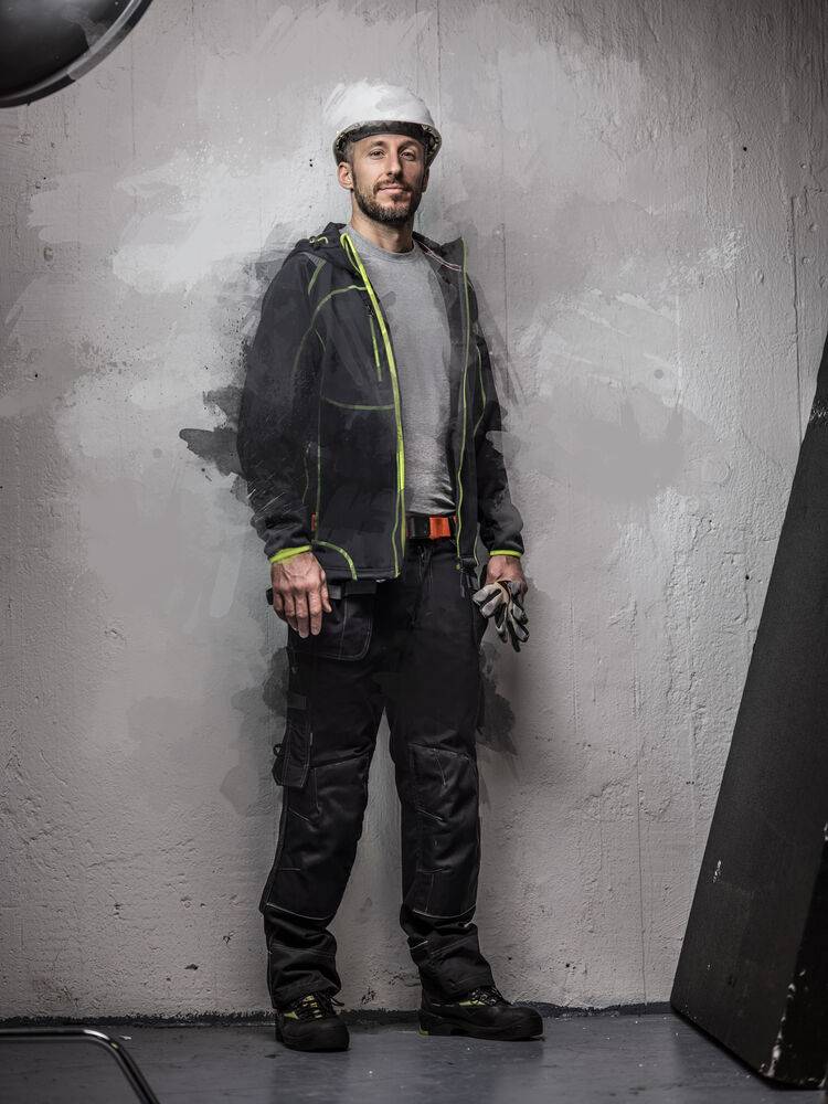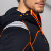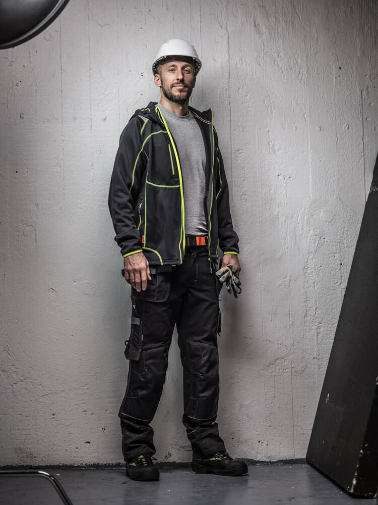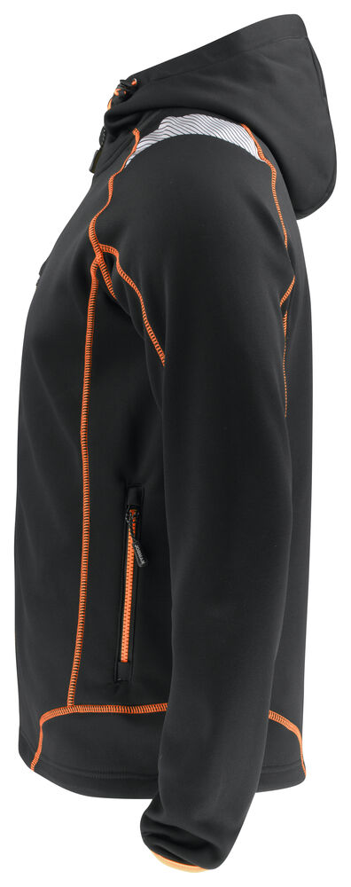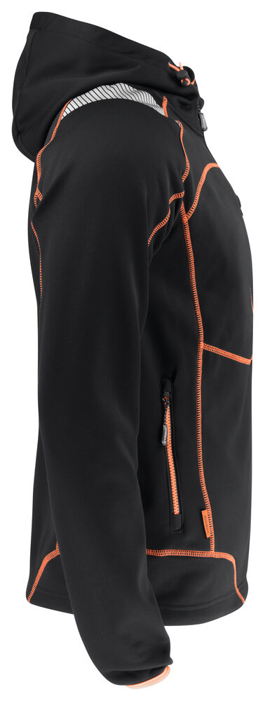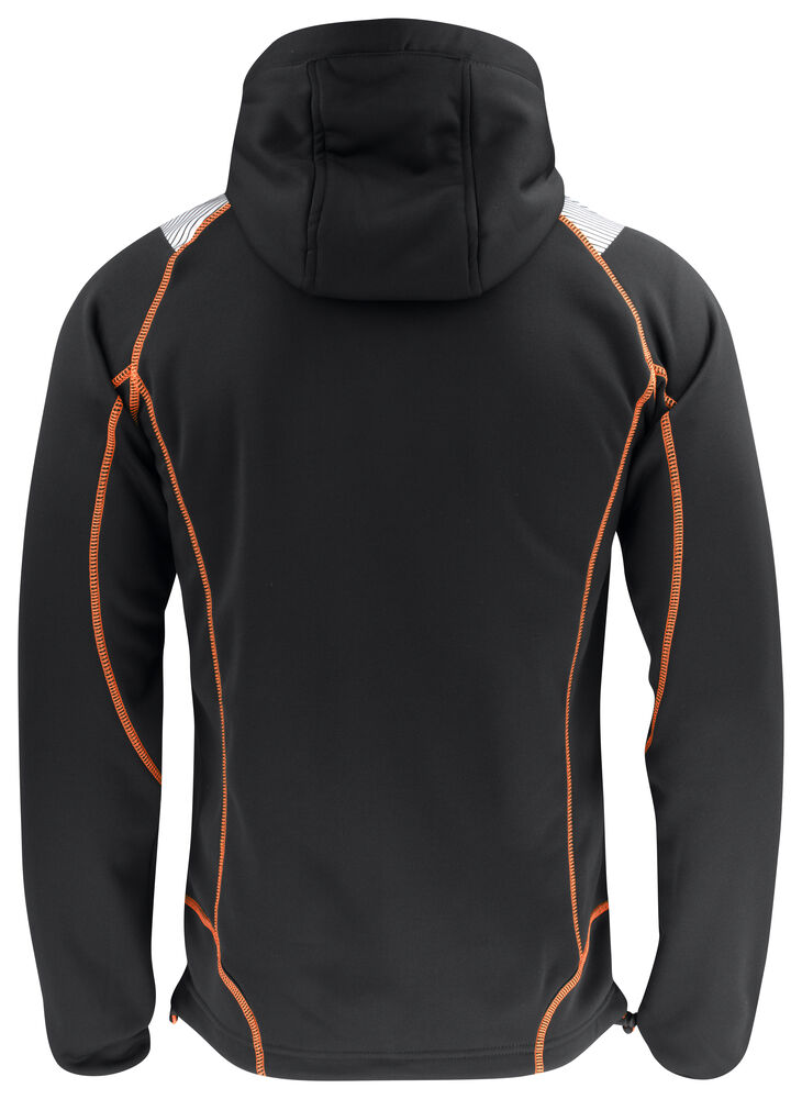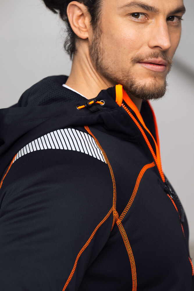 Hettejakke i elastisk polyester med fleeceinnside. Sømmer og glidelås i fluorescerende farge og reflekser på skuldrene. Glidelås foran med vindklaff. Brystlomme med glidelås og ID-kortholder. Sidelommer med glidelås. Store åpne innerlommer. Regulerbar hette med meshfôr. Flatlocksømmer. Regulerbar med snor nede.