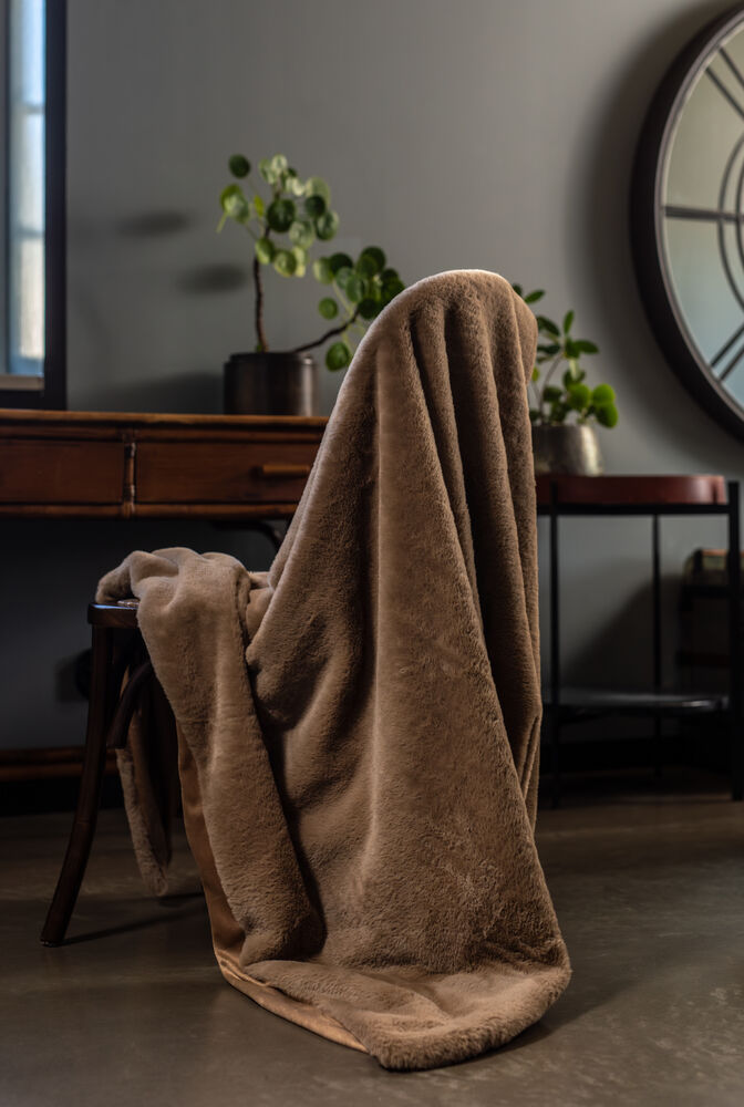 Fantastiskt, mykt og varmt pledd laget av fuskepels og mikromink som gir den et pelsaktig utseende. Teppet er stort og varmende, og forsterker følelsen av hygge i hele rommet.