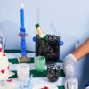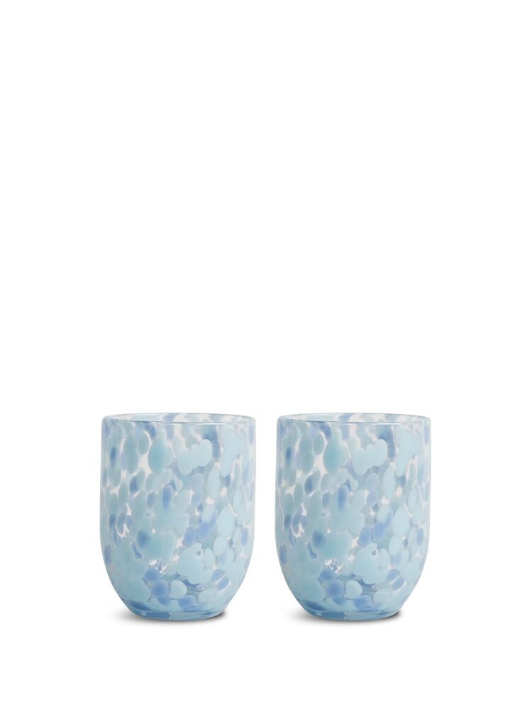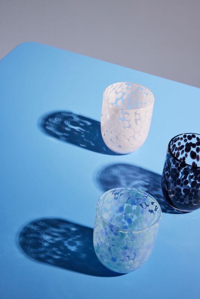 Som en deilig karamell i et tykt glass. Alle unike på hver sin måte, håndlaget og håndblåst i et lekent og rotete mønster i den perfekte blåfargen. Vi serverer drikke, juice, melk eller kaffe. Glassene kan brukes som lyslykt, eller piffe opp badet som et fantastisk tannbørsteglass. Håndlaget, farge- og teksturforskjeller kan forekomme. Tåler vask i oppvaskmaskin. Design Byon Studio. Leveres i 2-pakninger i Byon-boks.
