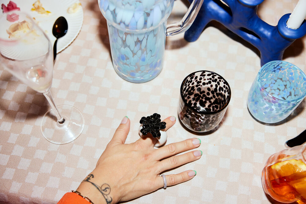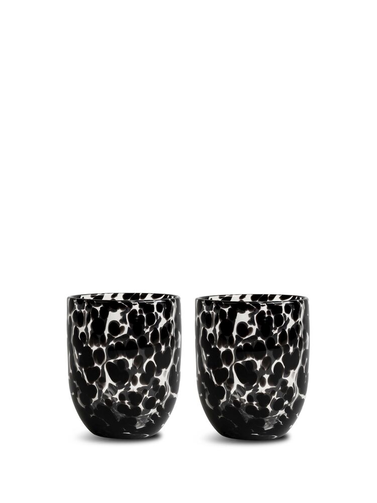 Som en lekker lakriskaramell – søt, deilig og uimotståelig. Laget av håndblåst glass med et lekent konfettimønster av midnattsvarte toner. Vi serverer drikke, juice, melk eller kaffe. Glassene kan brukes til telys, eller piffe opp badet som et fantastisk tannbørsteglass. Håndlaget, farge- og teksturforskjeller kan forekomme. Tåler vask i oppvaskmaskin. Design Byon Studio. Leveres i 2-pakninger i Byon-boks.