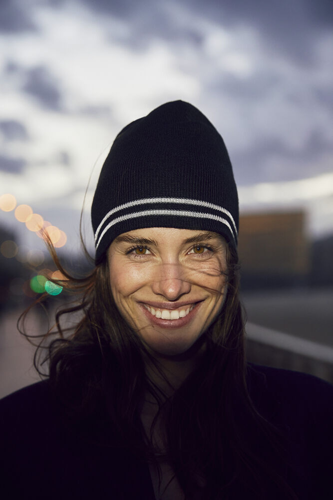 Finstrikket lue med 6-sømstopp, samt bomullsfôr på innsiden. To reflekterende striper for god synlighet.