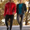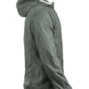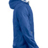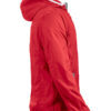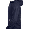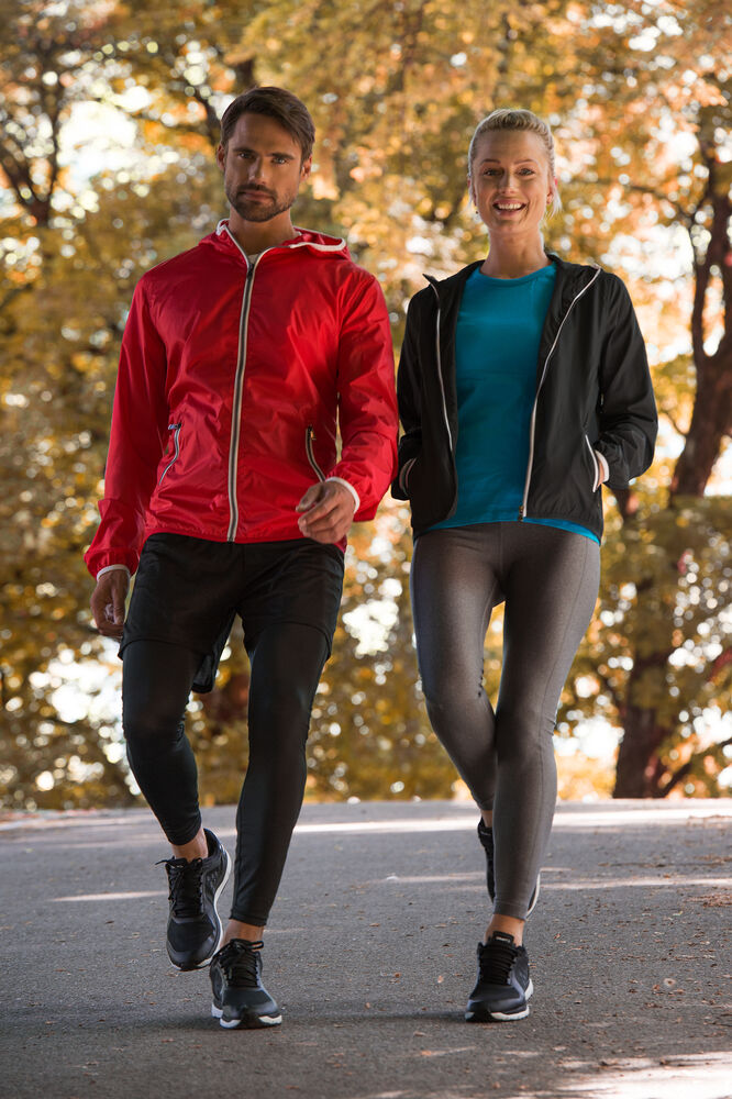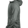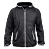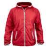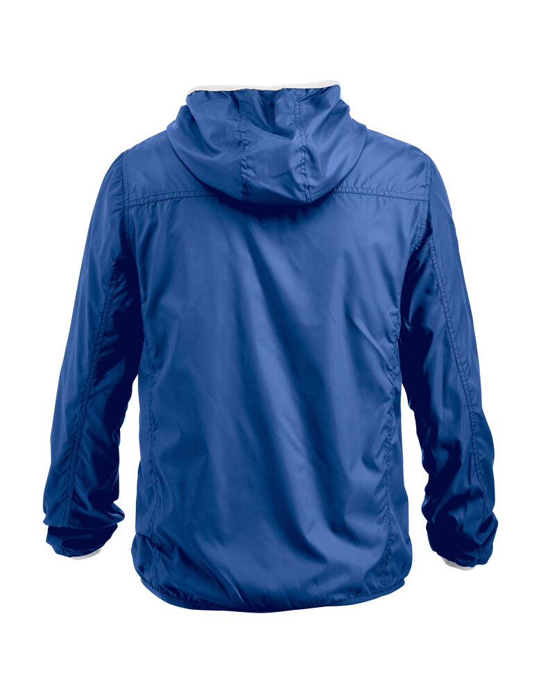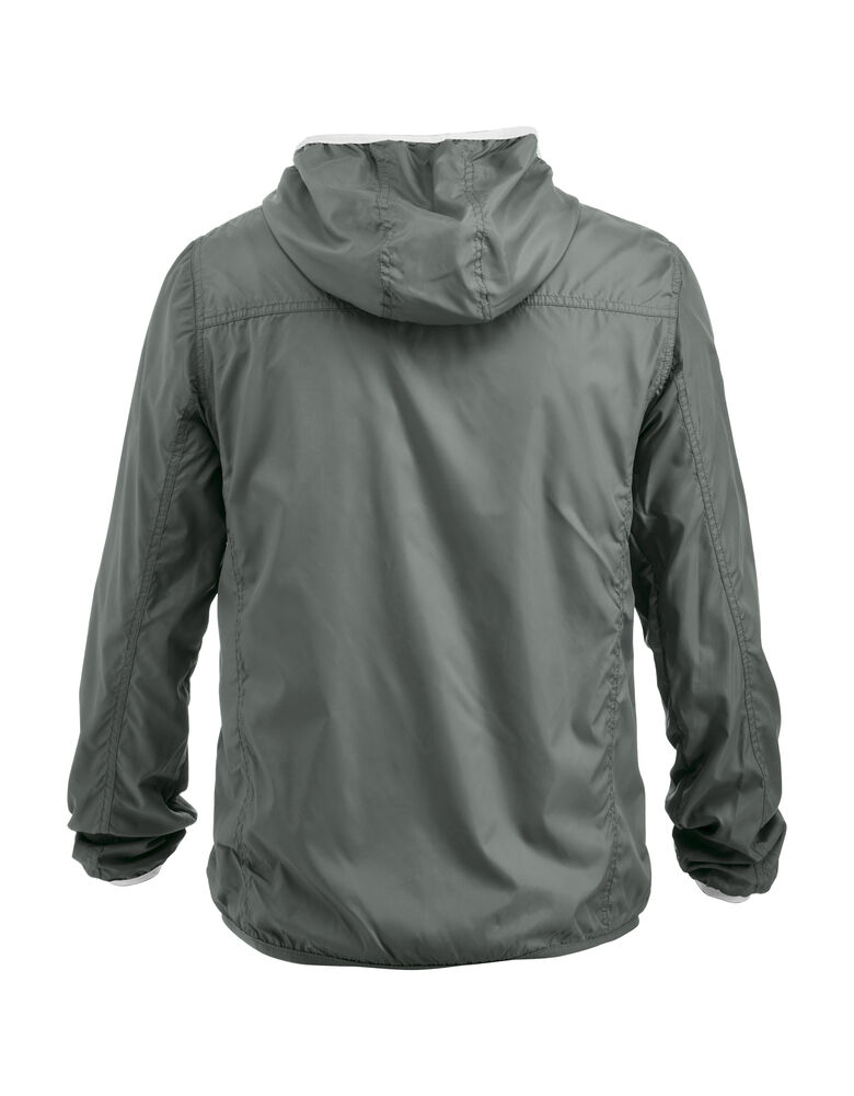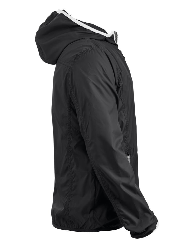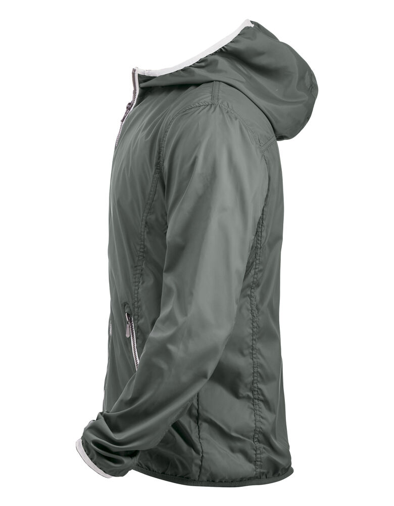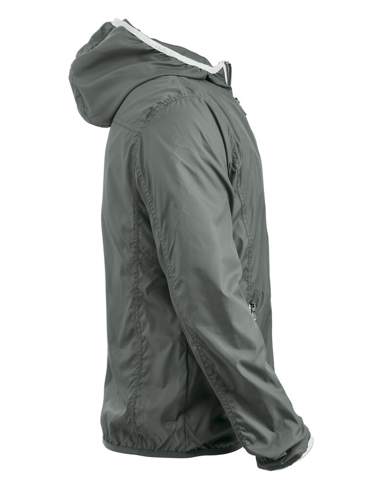 Moderne vindjakke med hette samt metall-lignende glidelåser. Meshfôr på innsiden. Kantbånd på hette og nederkant av ermene i kontrastfarge