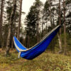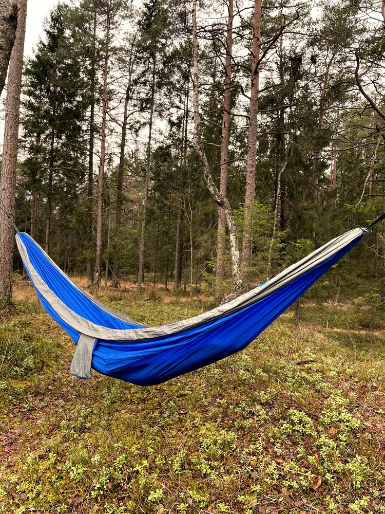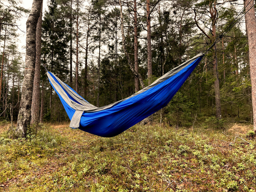 Praktisk hengekøye som enkelt kan pakkes ned i sin egen oppbevaringspose. Hengekøyen er laget av 210T nylon taffeta, kommer med 2 x 2 meter sterke nylontau og 2 stk. 8# karabinkroker.