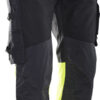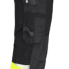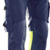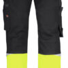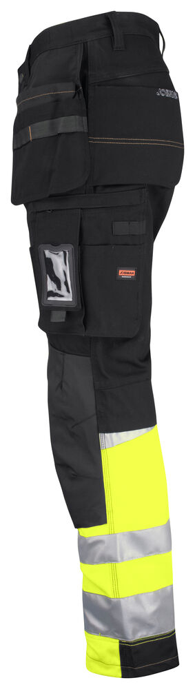 Romslige hengelommer med ekstra rom og forsterket innside. Påsydde forsterkede frontlommer som hengelommene kan puttes i. Hammerhank. Baklommer med forsterket innside. Benlomme med ID-kortholder og mobiltelefonlomme. Forbøyde knær for optimal passform. Knebeskyttelseslommer i slitesterkt polyamid med to posisjoner for knebeskytterne. Fluorescerende stoff og reflekser på bena. Benkant i polyamid hindrer at fukt suges opp.