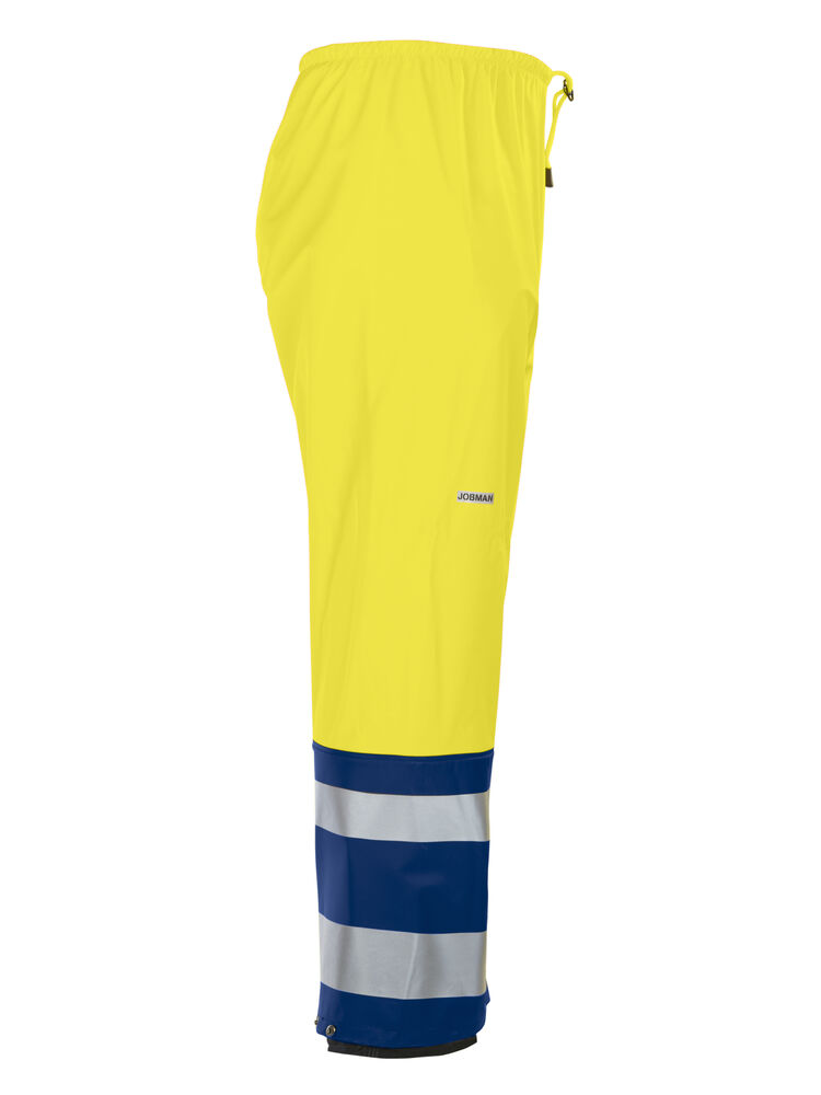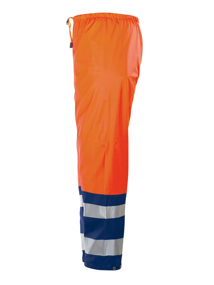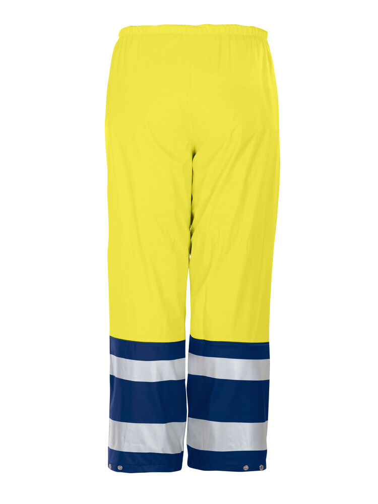 Slitesterk regnbukse sertifisert i varselklasse 2. Sertifisert ifølge EN 343, noe som innebærer at den er godkjent i henhold til EUs regler for regntøy. Sydde og sveisede sømmer. Linning og strikk i midjen. Regulerbare ben.