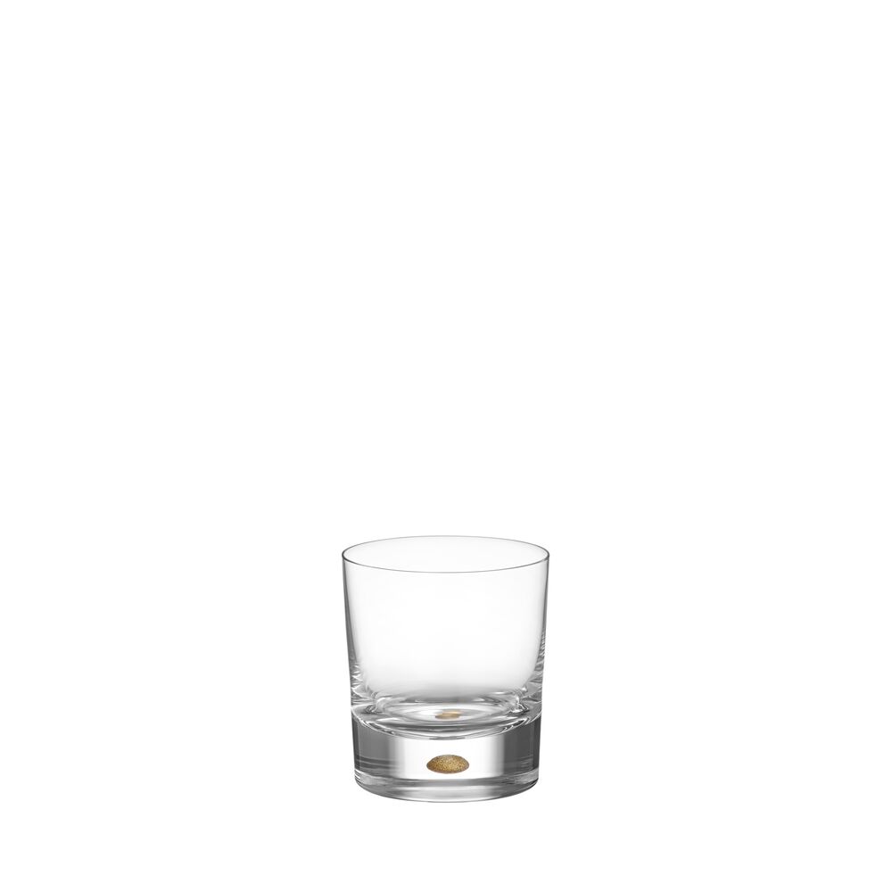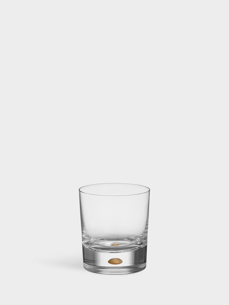Våre håndverkere og Erika Lagerbielke har lenge forsøkt å fylle Intermezzos karakteristiske boble med gullpigment. Endelig er den der, bakt inn i det krystallklare glasset – en matt gullskimrende dråpe. Old Fashioned-glasset, som rommer 25 cl, egner seg godt til å servere diverse brennevin eller cocktailer, med eller uten alkohol. Glasset er munnblåst i Sverige av våre dyktige glassblåsere. Designet av Erika Lagerbielke.