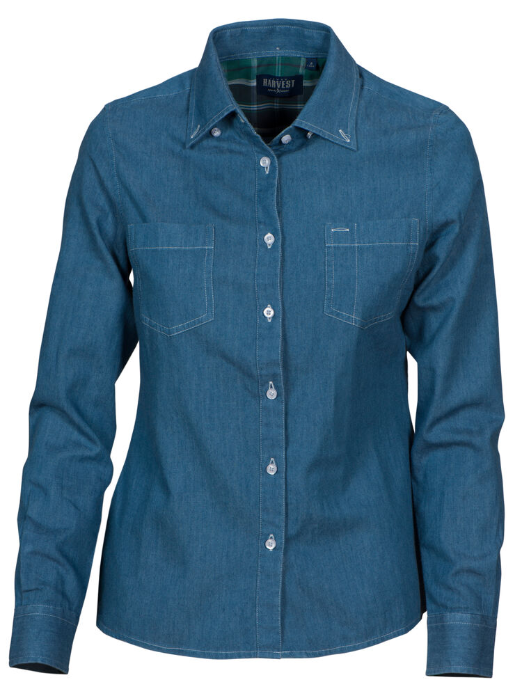 Denimskjorte til dame. Button down krage og justerbare mansjetter. Brystlomme på begge sider. Rutemønstret kontrast på innsiden av bærestykket og i mansjettene. Lett innsvinget modell.