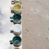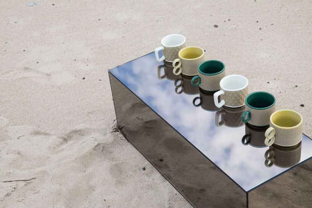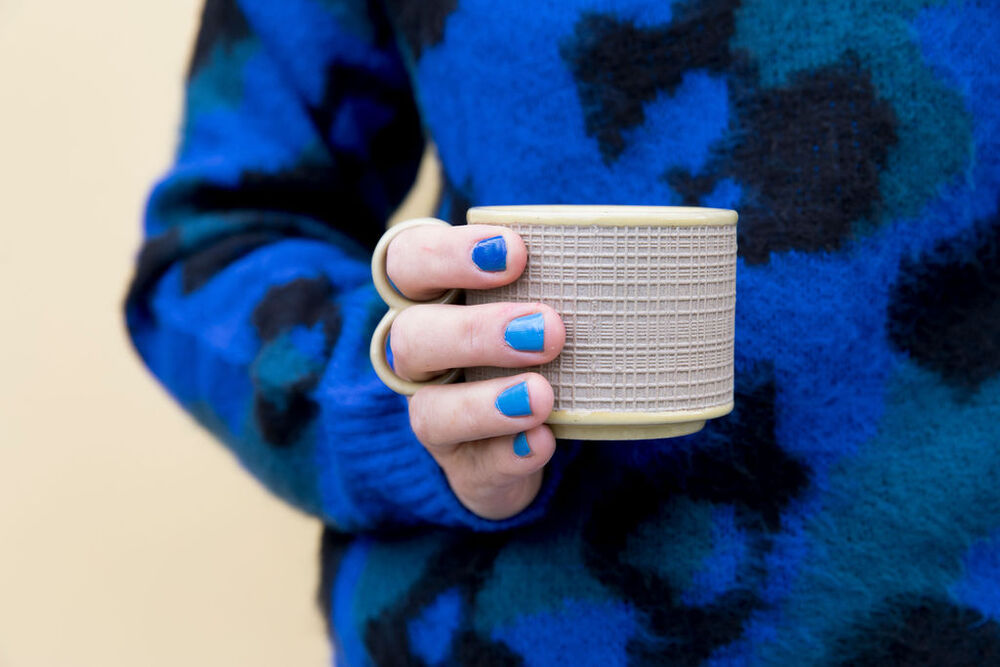 En kaffekopp i retrodesign med tidsriktig preg og doble håndtak. Innvendig i vårens må-ha-farge gul, utvendig i en mønstret beige tone.