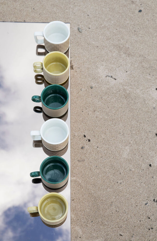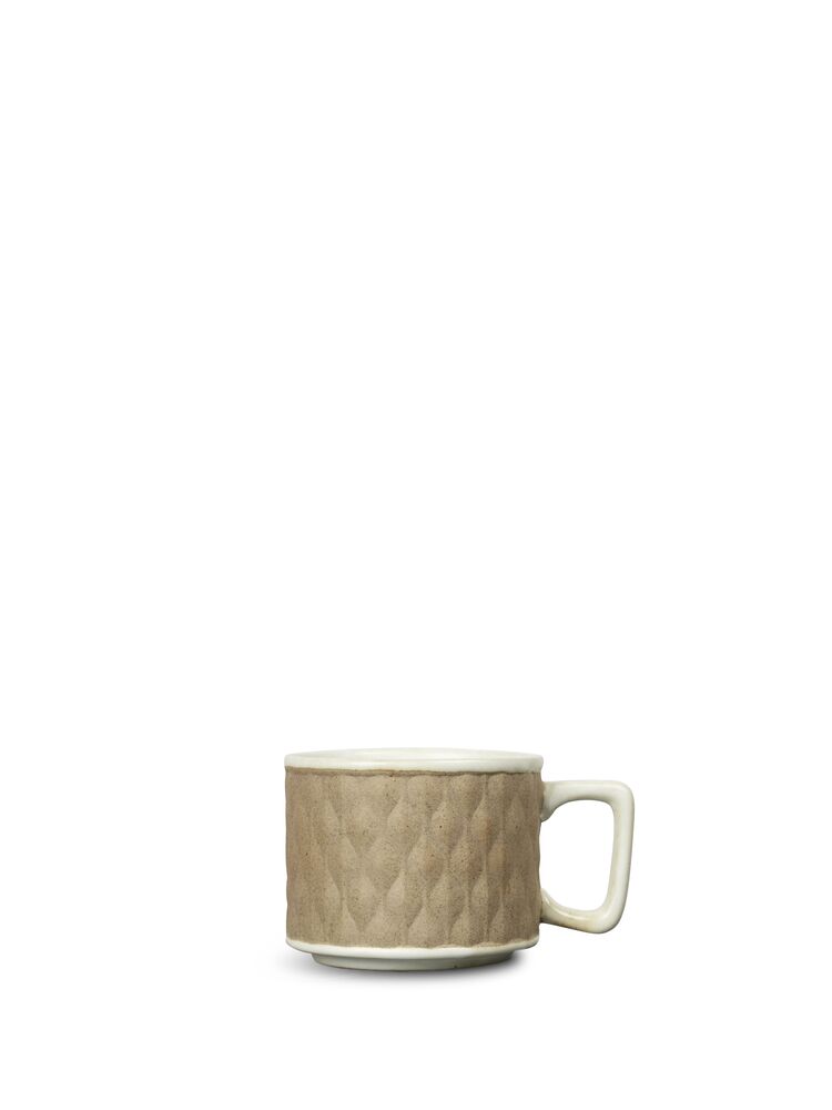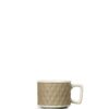 En kaffekopp i retrodesign med tidsriktig preg. Innvendig hvit, og utvendig i en rutete beige tone.