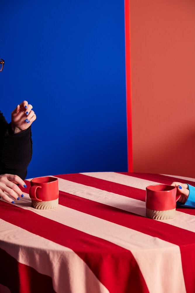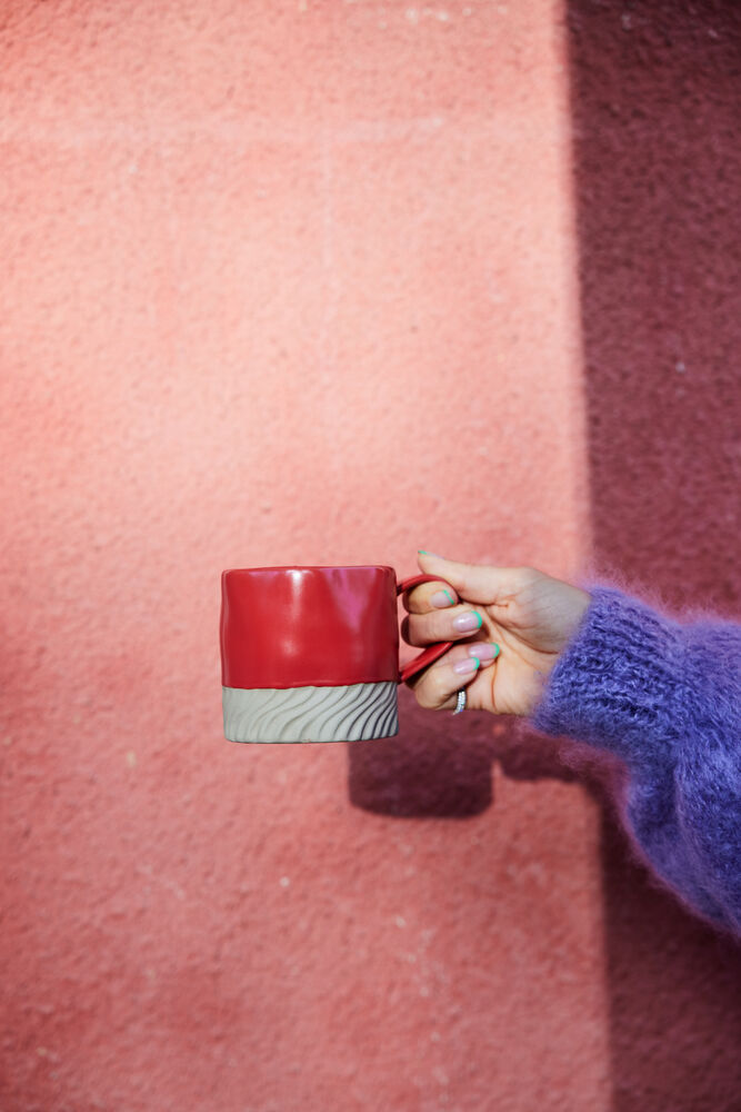 Uregelmessig, rund, snirklete, organisk, overdimensjonert og med skrå, kaotiske striper. Den eneste koppen som gjør alt feil og derfor er 100 % rett. Kruset Swirl puster Byon inn i hver eneste detalj. Fargen er myk valmuerød i kombinasjon med en naturlig tone av leire.
