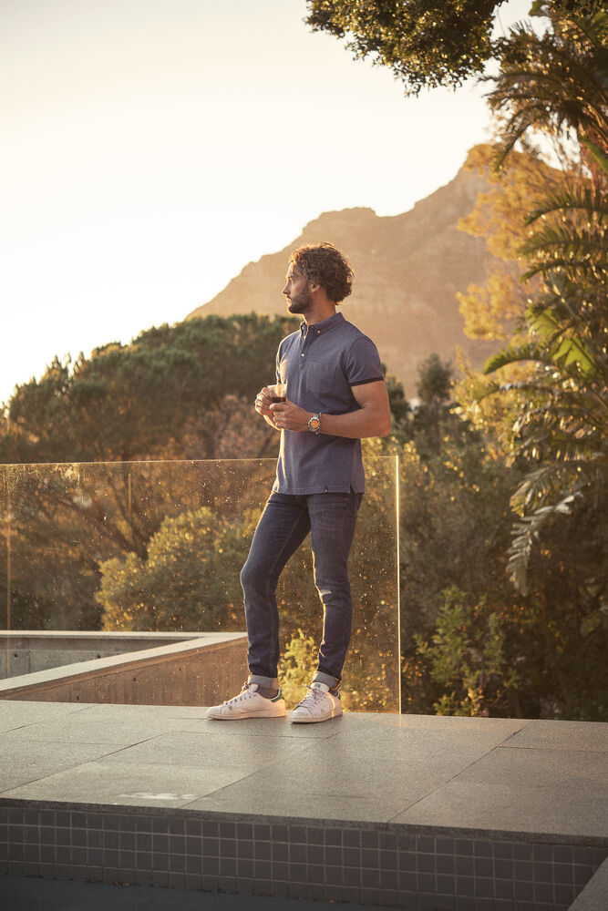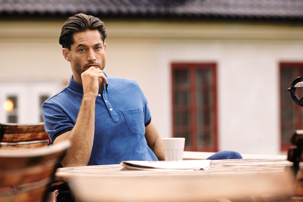 Polo pique med button down krage og brystlomme. Detaljer i oxford i krage og knappestolpe. Ermavslutning med ribb i kontrastfarge.
